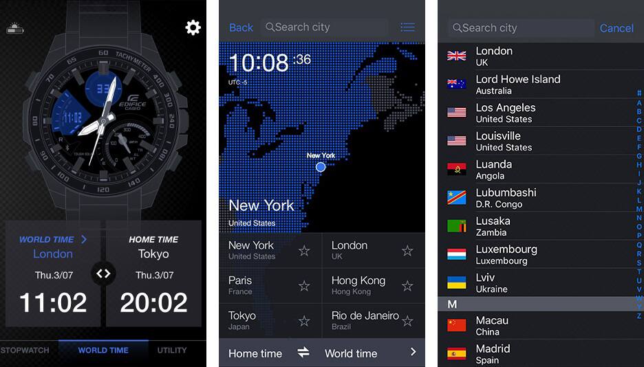스마트폰 앱을 사용하여 세계 시간을 표시할 도시를 선택할 수 있습니다. 세계 지도나 300개 이상의 도시가 포함된 도시 목록에서 터치를 사용하여 도시를 선택하면 선택한 도시의 시간이 DST(일광 절약 시간)가 포함된 인셋 다이얼에 표시됩니다.