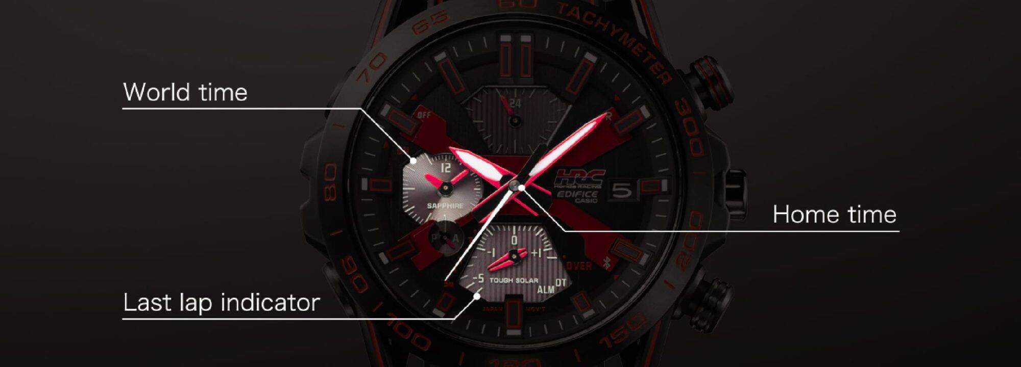 시계는 두 도시의 시간을 동시에 표시할 수 있습니다. 기본 다이얼은 한 도시의 시간을 표시하고, 9시 위치의 인셋 다이얼은 다른 도시의 시간을 표시합니다. 마지막 랩 표시기는 이전 랩 타임과의 시간 차이를 표시합니다.