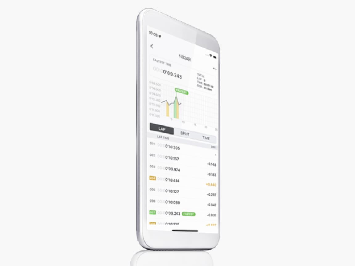 최대 200회의 랩 타임을 저장하고 스마트폰으로 전송하며 밀리초 단위로 측정합니다.