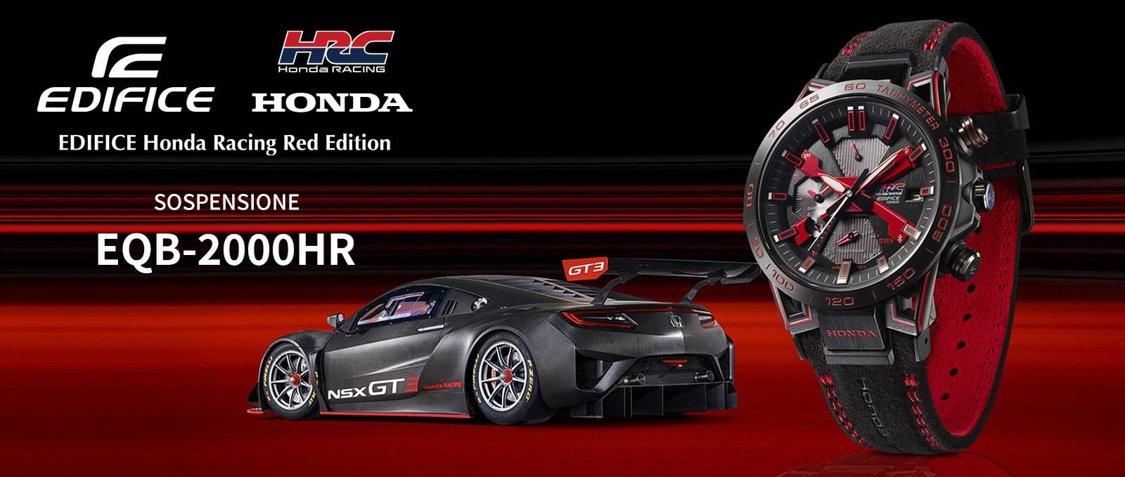 Honda의 스즈카 서킷 설립 60주년을 기념하는 Honda Racing Red Edition을 소개합니다. Honda의 레이싱 정신을 상징하는 빨간색 Honda 엠블럼에 사용된 것과 동일한 순정 도색이 특징인 이 시계는 독특한 서스펜션 암 디자인을 도입한 EDIFICE SOSPENSIONE EQB-2000에 바탕을 두고 제작되었습니다. 또한 밴드는 Honda Type R 차량의 인테리어에 사용되는 세련된 소재인 Alcantara®로 제작되었습니다. Honda의 감독 하에 만들어진 오리지널 디자인은 모터스포츠에 대한 Honda의 열정을 극명하게 표현합니다.