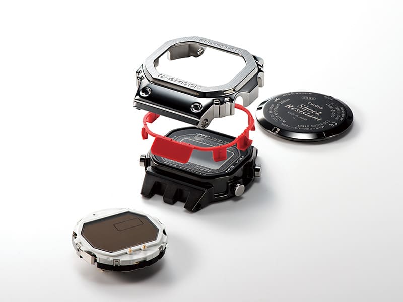 최초의 G-SHOCK과 마찬가지로 GMW-B5000TVB는 단단한 밀폐를 보장하는 스크루 록 케이스 백을 사용합니다. 티타늄으로 제작되어 강도가 높고 가볍습니다. 케이스 백을 다이아몬드 유사 탄소(DLC)로 코팅하여 내마모성이 향상되었습니다.