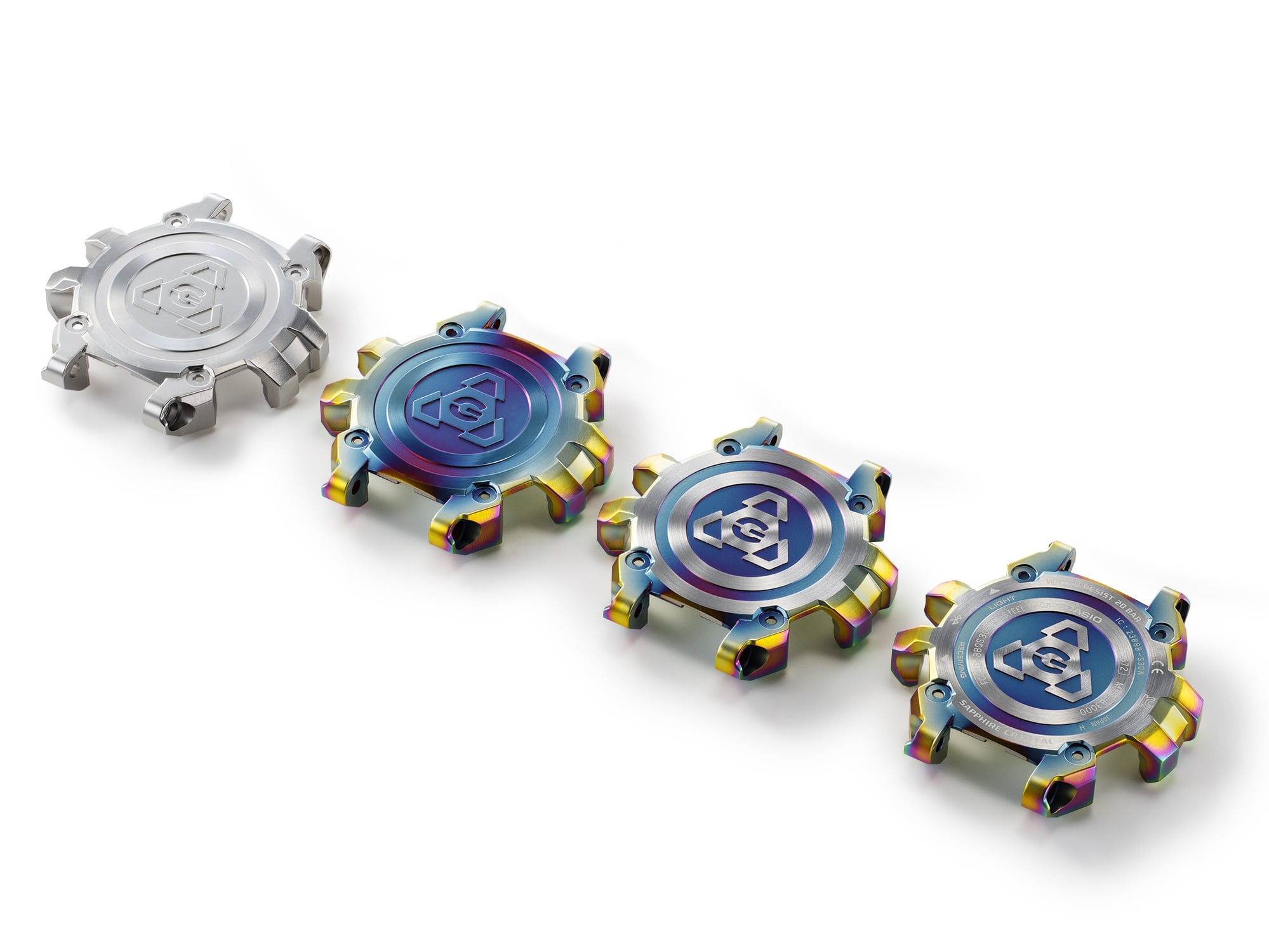 측면이 올라간 복잡한 형태의 케이스 뒷면은 상단 베젤과 연동되어 정교한 금속 외관으로 깊은 느낌을 줍니다. 통합 몰딩은 단조, 절단, 연마의 반복 공정을 통해 높은 경도를 달성합니다. 또한 재료 표면에 무지개 IP 코팅을 적용하고 재연마 공정을 통해 케이스 뒷면 돌출된 부분에서만 코팅된 층을 제거하여 특별하고 독특한 마감을 만듭니다. 이 독특한 디자인 기술은 금속 특유의 광택과 다양한 색상으로 변화하는 색조를 결합했습니다.