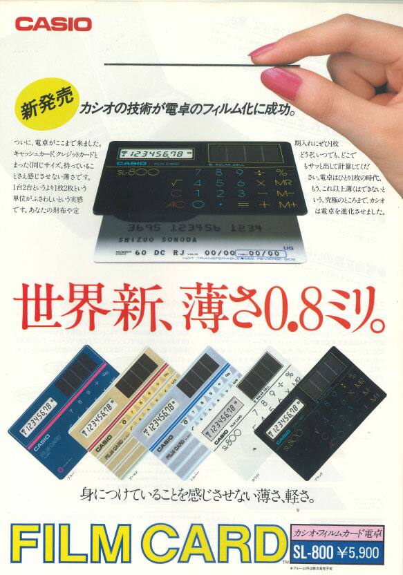 SL-800: Lanzado en 1983. Con componentes electrónicos tan delgados como una capa de película, la SL-800 tenía un grosor de solo 0.8 mm y un peso de 12 gramos. Este modelo combinaba la imaginación y las habilidades técnicas japonesas, y se consideraba lo más reciente en calculadoras portátiles.