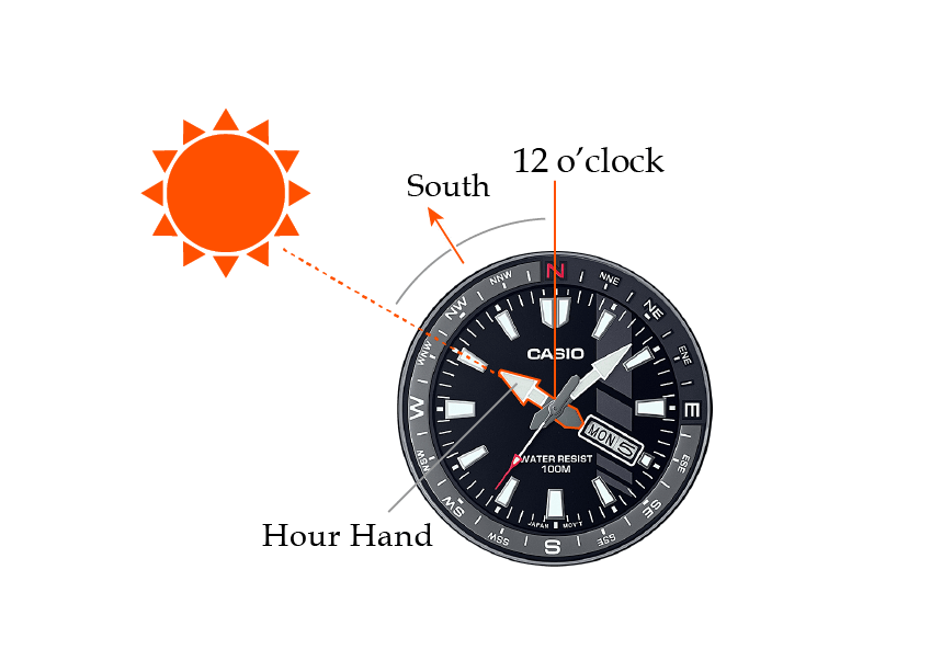 - Con el reloj en posición horizontal, apunte la manecilla de la hora hacia la dirección del sol. El centro del ángulo formado por la manecilla de la hora del reloj y la posición de las 12 indica el sur de forma aproximada.