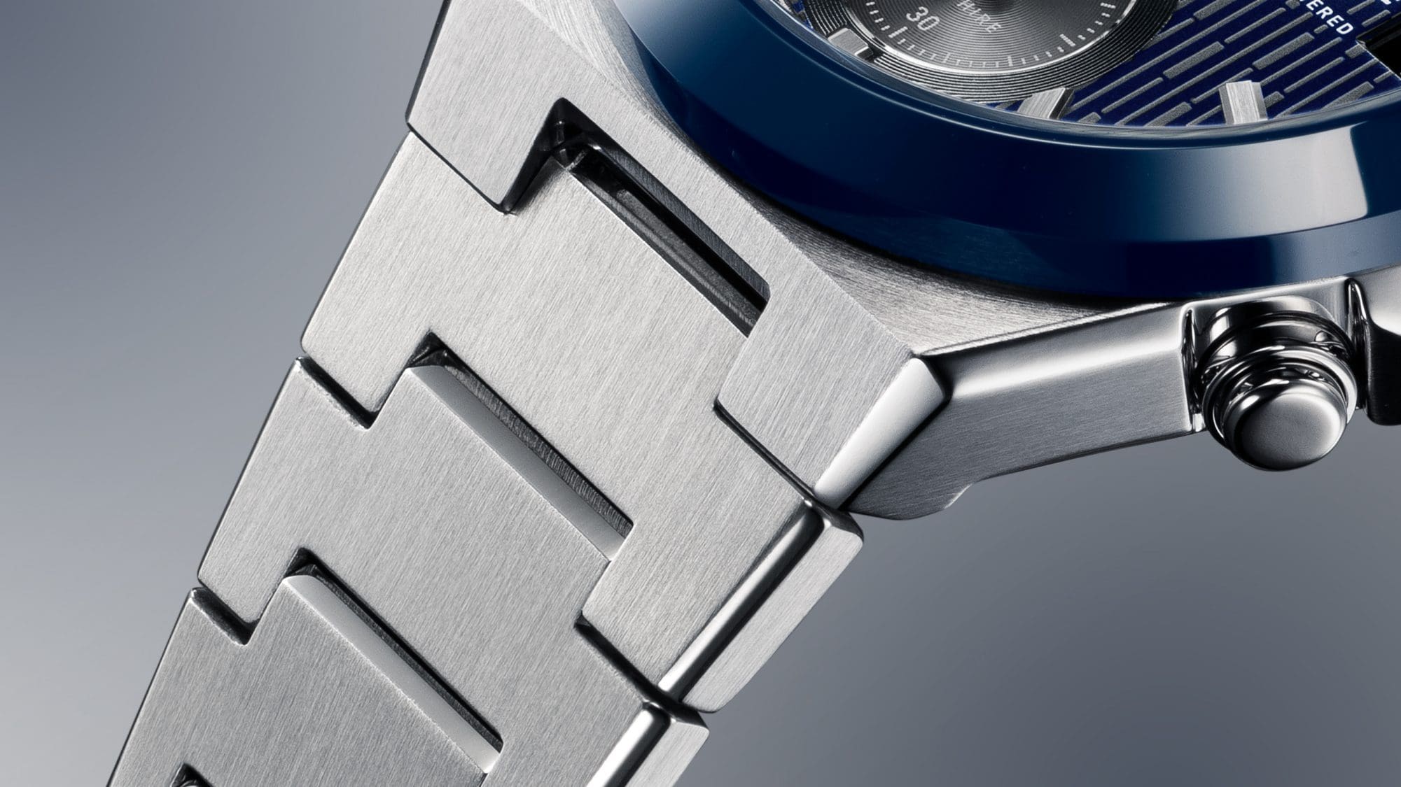 Fabricadas con acero inoxidable, la carcasa y la correa cuentan con acabados distintivos, un pulido espejado y fino aplicado a los componentes individuales. El diseño en las superficies planas enfatiza la integración perfecta de la carcasa y la correa, lo que crea una estética definida y pulcra con una sensación de solidez.