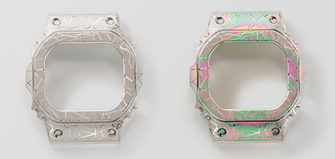El grabado láser se superpone con el baño de iones (IP) de arcoíris en el marco metálico para recrear el patrón cristalino de calcita y su magnífico resplandor de luz refractada. El dial y la correa están decorados con el mismo patrón.