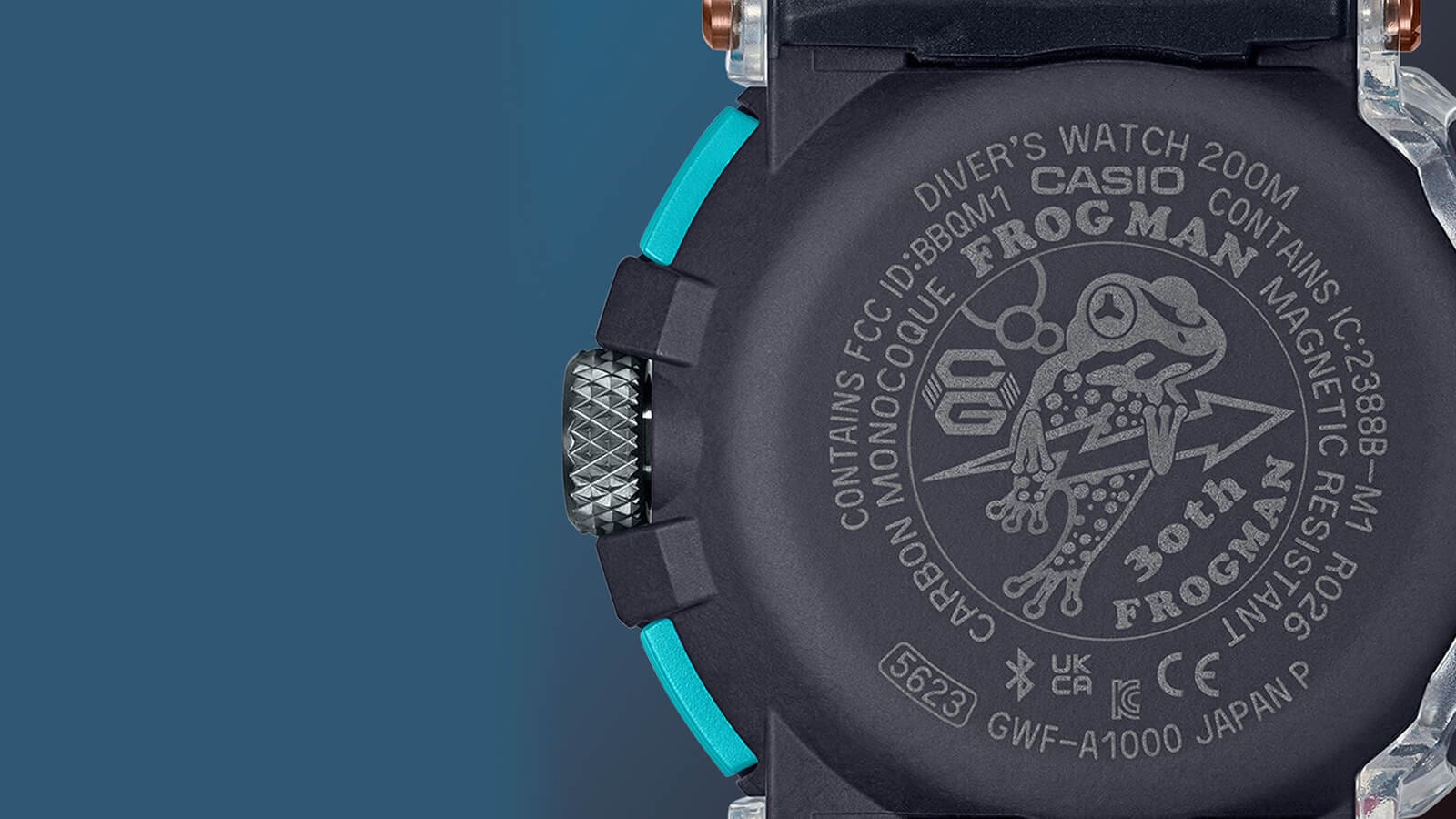 Sumérjase en la celebración del 30.º aniversario de la familia G-SHOCK Master of G FROGMAN de relojes de buceo completos con resistencia al agua de hasta 200 metros según la norma ISO. El primer FROGMAN causó gran impacto cuando se lanzó en 1993. La segunda edición limitada para conmemorar el 30.º aniversario de FROGMAN en el 2023 lleva al GWF-A1000 a un nivel completamente nuevo, con un diseño especial inspirado en la rana venenosa. El marco de carbono multicolor evoca las misteriosas tonalidades de esta rara especie de rana colorida que vive en el Amazonas sudamericano. Como son cortados a partir de un material base de coloridas fibras de carbono y vidrio laminadas en patrones aleatorios, no hay dos marcos exactamente iguales, lo que refleja la rareza de esta especie de ranas. La combinación de un marco extraordinariamente colorido y el uretano translúcido reproduce el aspecto y la sensación de la rana venenosa amante del agua. La correa está impresa con tinta polarizada para evocar el patrón con manchas de una rana, un detalle que se repite en la carcasa con el icónico personaje de rana reinventado como rana venenosa.