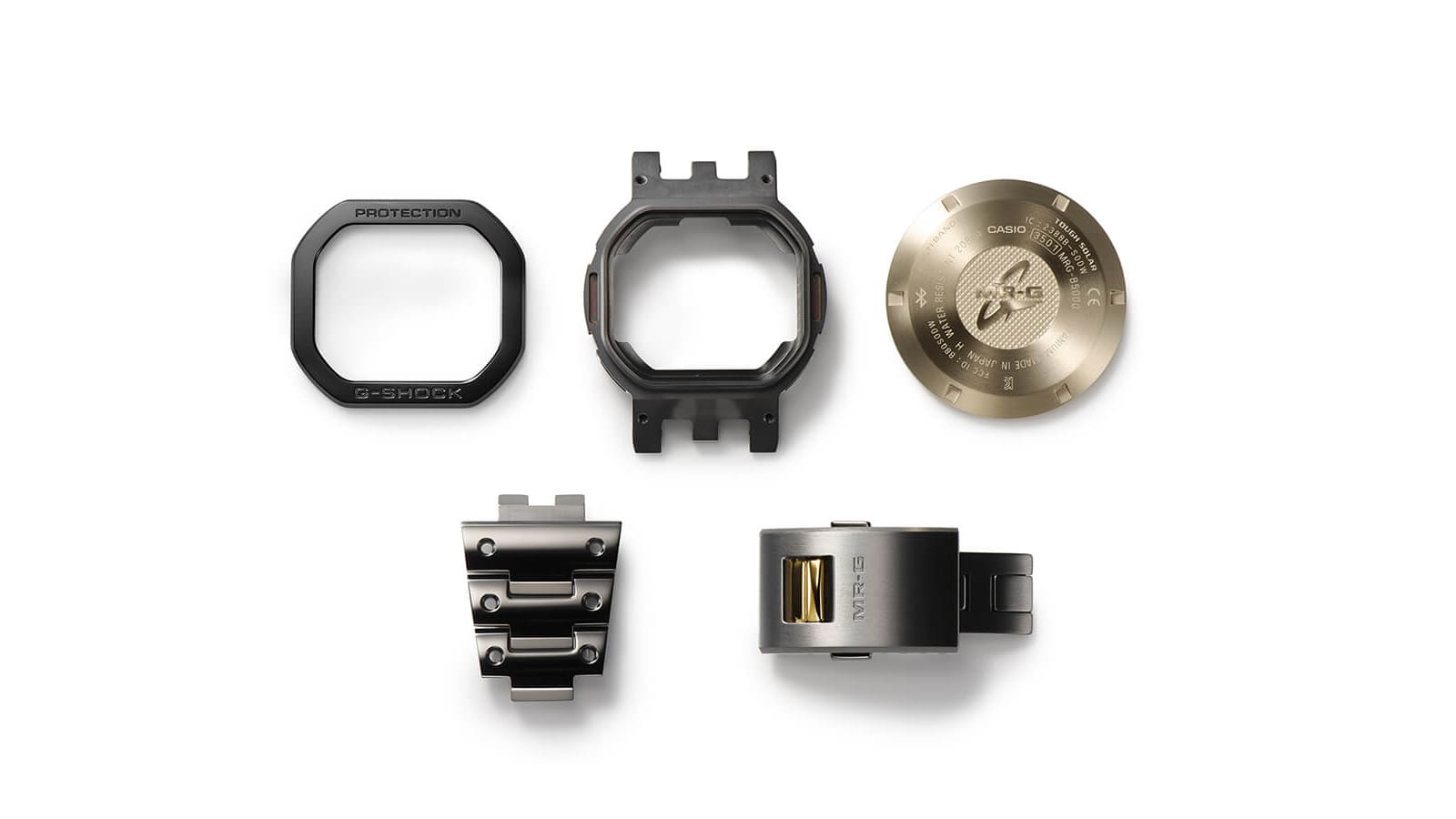 Un acabado de carburo de titanio le da al MRG-B5000D un deslumbrante brillo metálico, y el revestimiento de carbono tipo diamante (DLC, por sus siglas en inglés) aplicado a la carcasa y la correa del MRG-B5000B logra el icónico tono negro del primer modelo G-SHOCK, pero ahora en metal. Los componentes, incluidos los botones y la cubierta posterior, están terminados con IP de color dorado.
