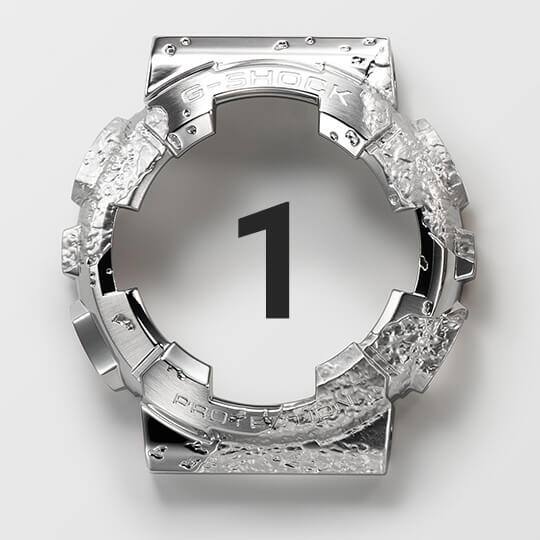 نستخدم التشكيل بالقوالب الخاصة بوصف ذلك جزءًا من عملية وضع اللمسات النهائية على الإطار المغطى بالمعدن، ما يضفي لمسة مقولبة خشنة مستوحاة من المعادن عبر وجه الإطار بالكامل. بعد ذلك، نمنح الأجزاء غير المستوية شحذًا لامعًا ونصقل كل جزء، من الأعلى إلى الجانبين، لإضفاء لمسة نهائية ناعمة أو عاكسة. ويتم إظهار شكل كل حجر وملمسه ولمعانه من خلال تقنيات معالجة المعادن الفريدة.