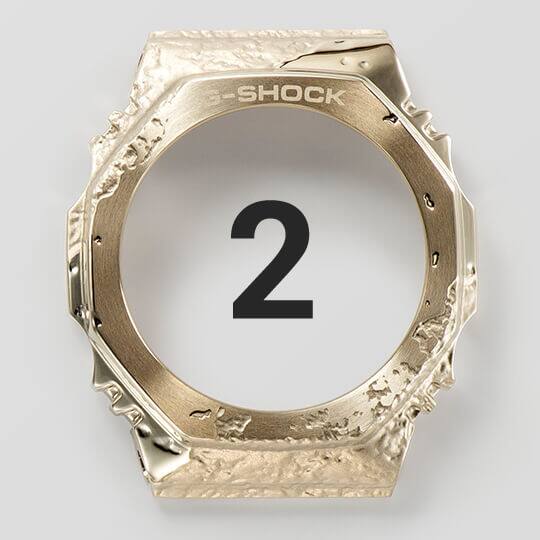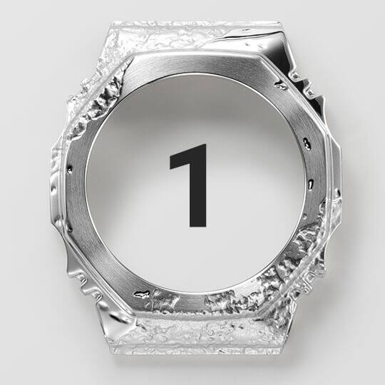 نستخدم التشكيل بالقوالب الخاصة بوصف ذلك جزءًا من عملية وضع اللمسات النهائية على الإطار المغطى بالمعدن، ما يضفي لمسة مقولبة خشنة مستوحاة من المعادن عبر وجه الإطار بالكامل. بعد ذلك، نمنح الأجزاء غير المستوية شحذًا لامعًا ونصقل كل جزء، من الأعلى إلى الجانبين، لإضفاء لمسة نهائية ناعمة أو عاكسة. ويتم إظهار شكل كل حجر وملمسه ولمعانه من خلال تقنيات معالجة المعادن الفريدة.