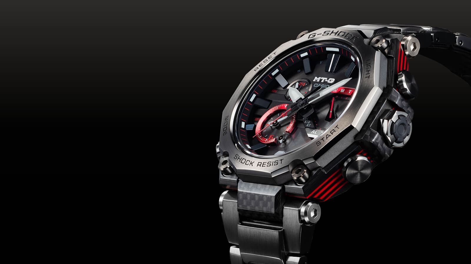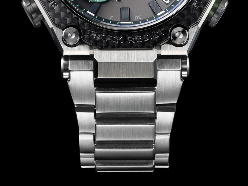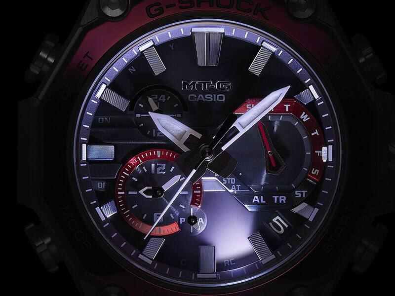 لقد دمجنا بنية MT-G للحماية الأساسية من المعدن مع بنية G-SHOCK للحماية الأساسية من الكربون. يتم وضع هيكل أحادي البنية مصنوع من الراتينج المقوى بألياف الكربون داخل إطار معدني يتصل بموضع زجاجة الساعة — ما يحقق متانة عالية، وإحكام ربط، وتقليل الوزن في الوقت نفسه.