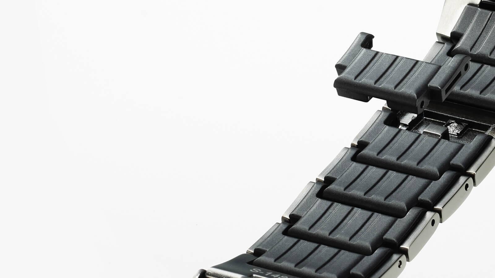 بالإضافة إلى مكوّنات الراتينج الصافي، يوفر الحزام المعدني طابعًا قويًا وملاءمةً رائعة. تم تقليل الوزن كذلك باستخدام مكونات معدنية جوفاء مصنوعة بالتشكيل بحقن المعادن (MIM). ويوفر الهيكل الذي يعمل بآلية التمرير المزدوجة سهولة تركيب الحزام وإزالته.