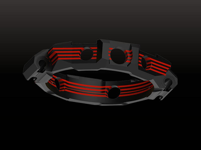 تتم الاستفادة من عمليات الضغط والقطع المتطورة للحصول على إطار ذي شكل معقد مصفّح بطبقات متعددة من ألواح ألياف الكربون والزجاج. يزدان الجزء الخارجي من الساعة بحبكته الفريدة من ألياف الكربون في السطح العلوي وبنمط الصفائح الخضراء والسوداء المطوّر حديثًا على طول الجوانب.
