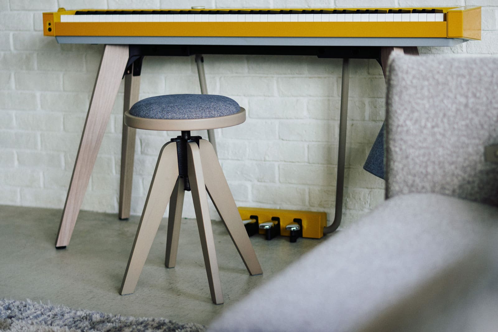 The stool's design was carefully crafted to complement the "PX-S7000. "The straight legs of the stool perfectly match the stand of the 'PX-S7000,'" Yamasaki confidently exclaims. "Vintage stools tend to have shorter legs and more curves, but we made the legs straight to create a modern form," adds Takuro.