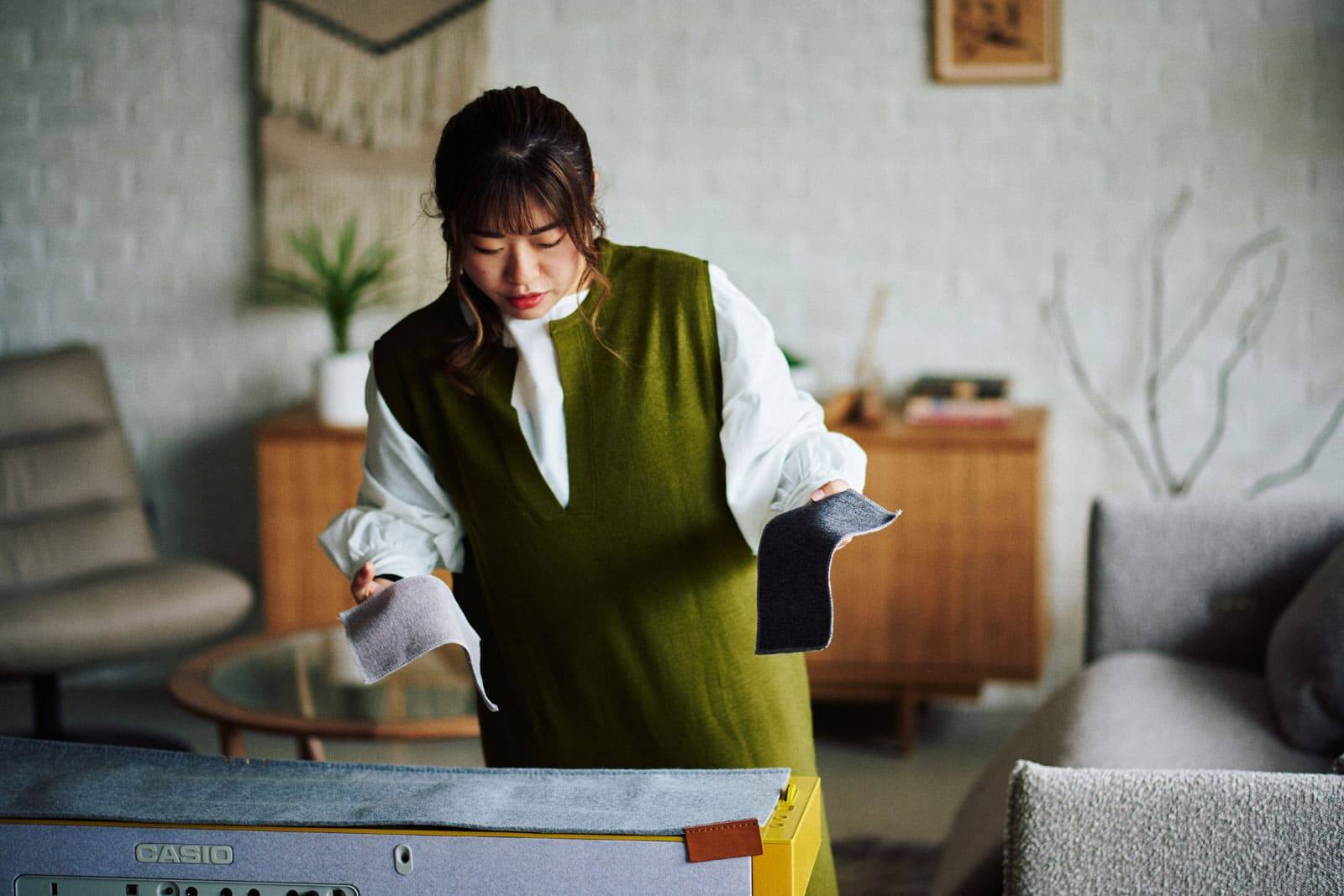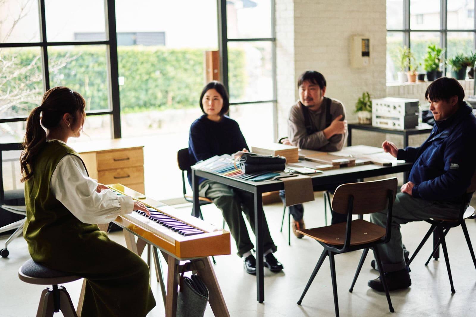 When playing pianos, the comfort of the stool is also important. The design of this stool was made with the assumption that you will be sitting for long periods of time, unlike typical interior stools. "As for the comfort of the seat, we made it by carving out the wooden seat and embedding cushions into it to achieve maximum comfort when playing. Usually, when we make stools, we don't consider sitting on it for long periods of time. However, this time we emphasized the comfort for piano players as a unique functional aspect of the stool. By using thick urethane foam, we made a stool that can be sat on for long periods of time. In addition, we made the cushion part look thinner by embedding it in the wooden seat giving it a sophisticated look," explains Takuro. Anna, who had multiple pianists try out the stool to test its comfort, nods and adds, "It's because of that thickness that you don't get tired even after playing for a long time. The people who actually tried it out said they could sit and play the piano or practice for a long time, and they complimented how comfortable the seat was compared to conventional models." According to Anna, the cushion fabric was also chosen from amongst multiple samples by both CRASH GATE and CASIO's designers to harmonize with the "PX-S7000" speaker fabric and piano cover. This stool is the product of the combined perspectives and attention to detail of an interior design brand and CASIO’s own designers. "Not only did they listen to our wishes as a musical instrument manufacturer, but they also made use of their specific know-how as an interior design company. CASIO alone could not have made this stool," says Anna.