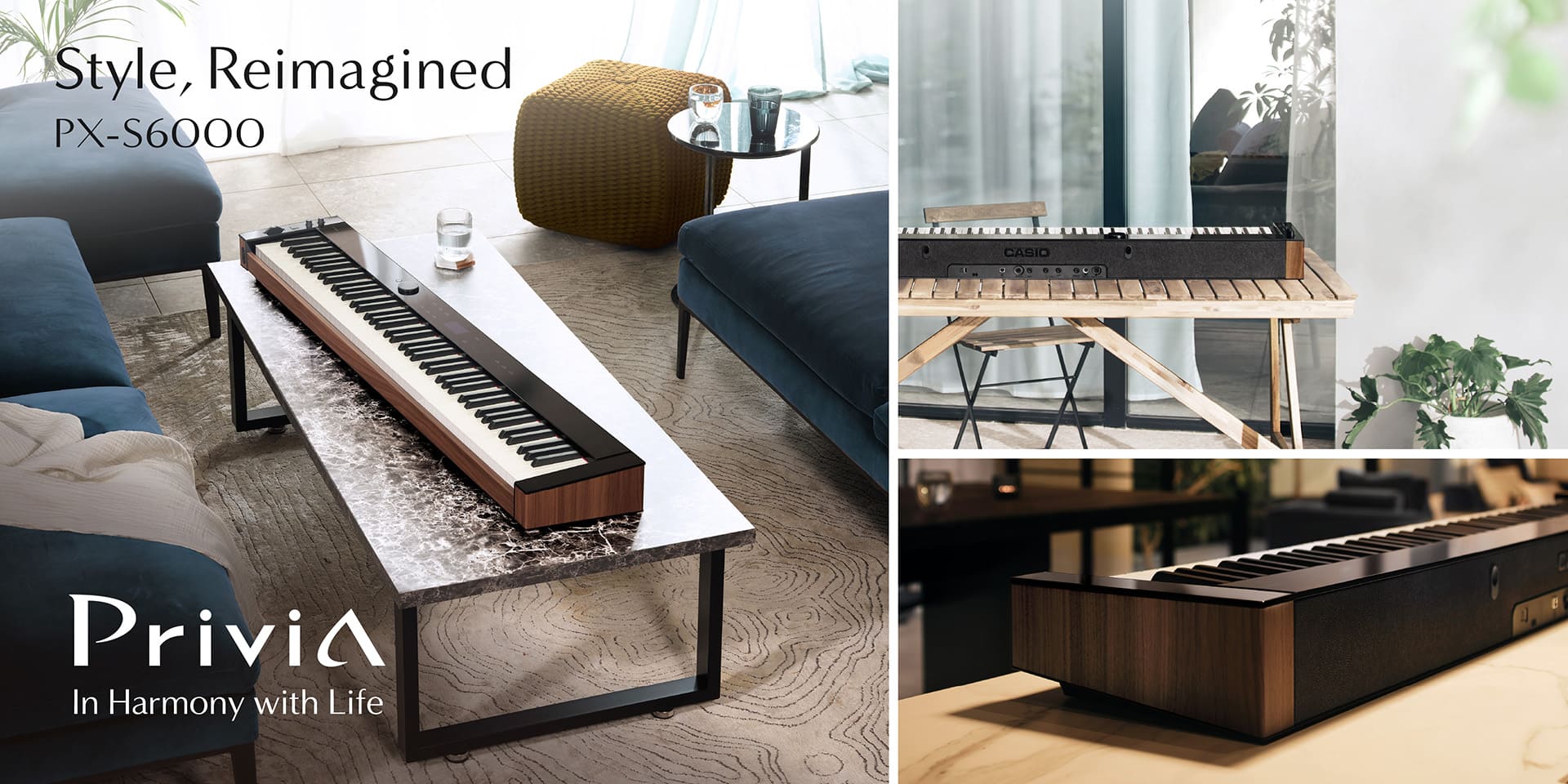 Con su diseño sofisticado, sonido inigualable, sensación auténtica y funciones innovadoras, la serie Privia ha reinventado la manera en que los pianos pueden incorporarse a nuestras vidas. Los modelos Privia PX-S7000 y PX-S6000 combinan la tecnología líder de Casio con diseños elegantes que le permiten experimentar un nuevo grado de armonía con su estilo de vida y entorno. El modelo PX-S7000 viene en tres colores e incorpora pedales y un atril que materializa atractivamente la estética tradicional del piano, mientras que el modelo PX-S6000 se puede tocar con o sin el atril (CS-90P; se vende por separado) según su preferencia y situación. Con el PX-S7000 o el PX-S6000, puede tener la libertad de elegir el estilo que mejor se adapte a su estilo de vida.