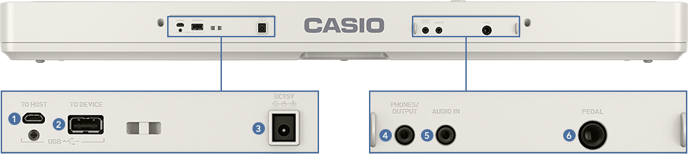 ① terminal USB A HOST ② terminal USB A DISPOSITIVO ③ terminal de CC de 9,5 V ④ Conector de TELÉFONOS/SALIDA ⑤ Conector de ENTRADA DE AUDIO ⑥ Conector para PEDALES
