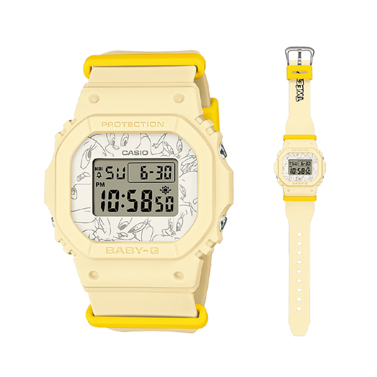 Nos asociamos con el canario de dibujos animados favorito de todos, Piolín, para una colaboración única. El reloj presenta colores e ilustraciones retro que encarnan el encanto adorable y enérgico de Piolín. El modelo base del reloj es el BGD-565 cuadrado en beige mate con detalles en amarillo canario en la hebilla de la correa.