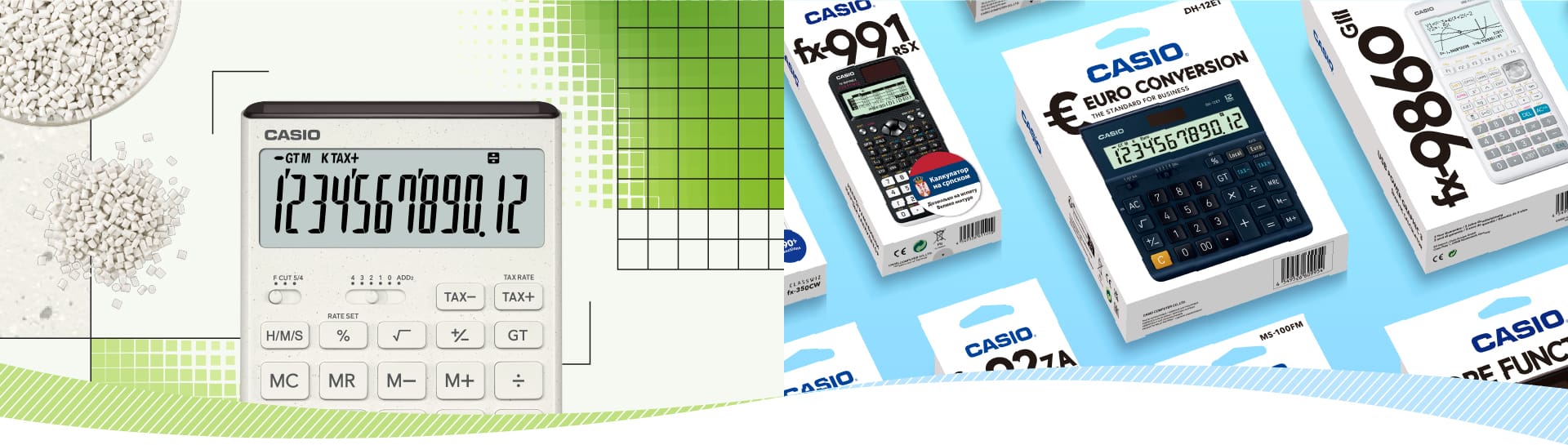 The “Casio Calculator ECO STANDARDS” reflect our past environmental initiatives and future commitments toward environmentally conscious and sustainable product manufacturing. Calculators that meet all of these evaluation criteria are designated as “Casio ECO-friendly Calculators.”