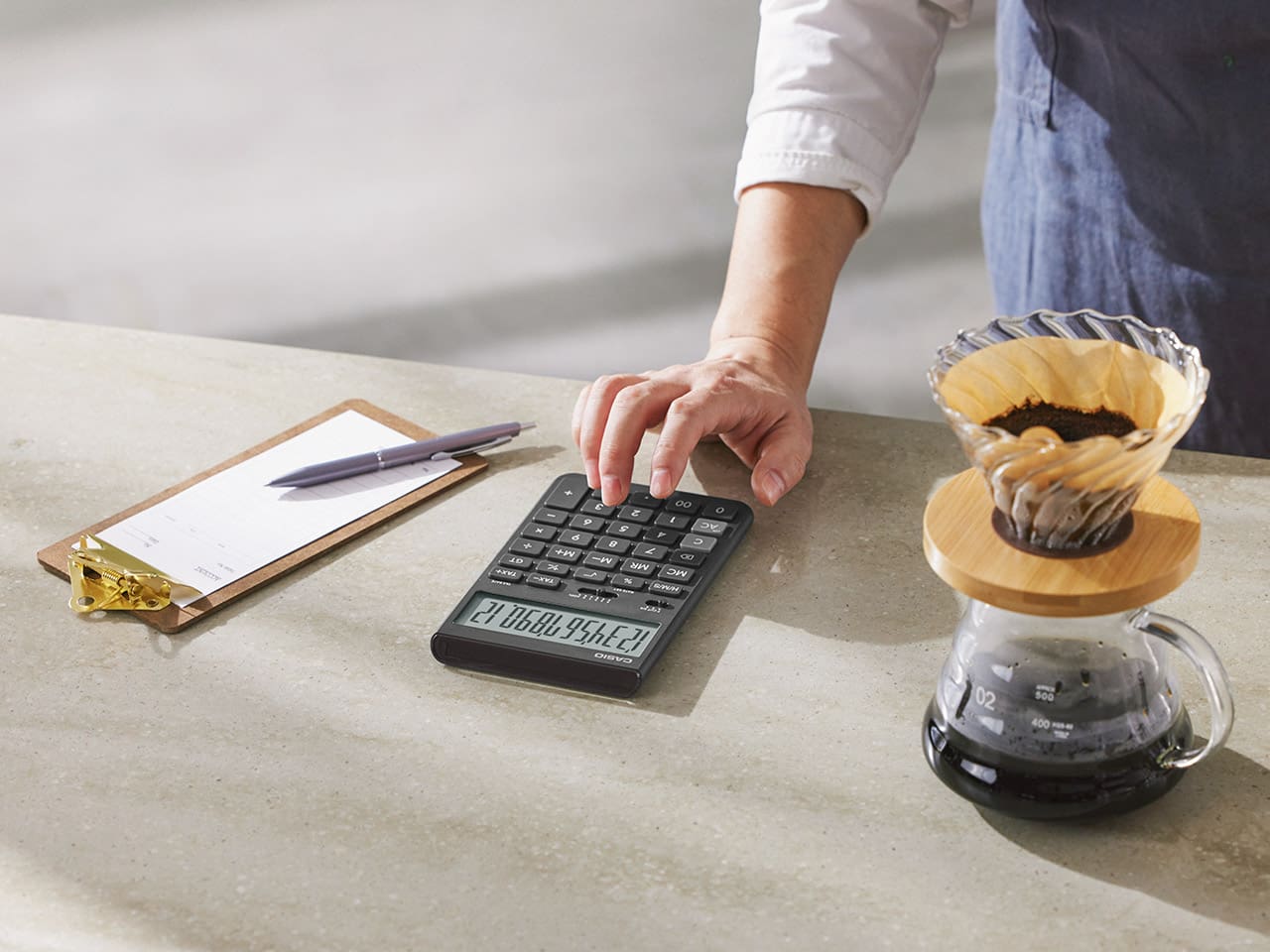 An eco-friendly design calculator that harmonizes with a variety of usage scenarios. Comes with a retractable stand that makes it easy to use whether you are sitting or standing.