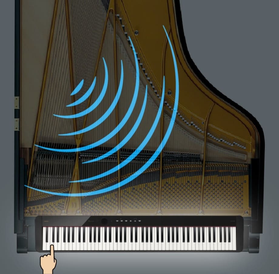 The harmonically rich sound of an acoustic grand piano is produced by a combination of the complex mechanism within the instrument's large body and the changes in overtone structure from the approximately 230 strings that resonate according to the player’s articulation, musical phrasing and use of the pedals. Casio's proprietary Multi-Dimensional Morphing AiR Sound Source produces the natural, full-bodied sound of a grand piano with incredible detail.