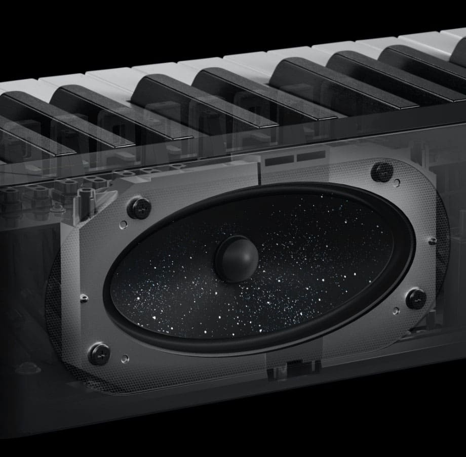 The speaker diaphragm has been made as large as possible within the confines of the space available to achieve a powerful sound. Mica, a reinforcing material used in many high-end audio products, is incorporated into the diaphragm of the PX-S1100/PX-S3100/PX-S5000 speakers to produce high frequencies with greater detail. In addition, the internal structure of the speakers allows for a wide range of voice coil movement for increased sound capacity, while producing richer and more resonant low frequency sounds. In short, every nuance the player expresses is faithfully reflected in the sound.