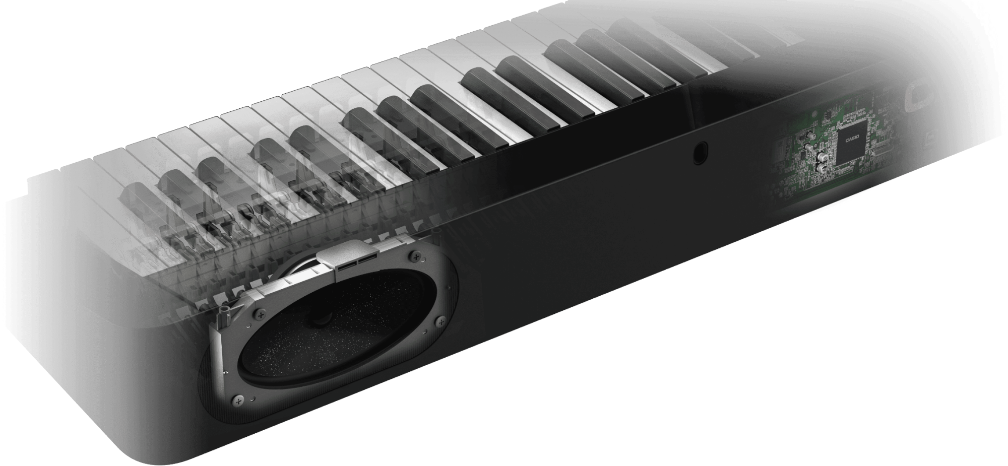 Casio has developed a unique yet compact hammer action mechanism that optimizes the hammer weight, center of gravity and moment of inertia to achieve a balance between the gentle response when the key is played softly and the dynamic response when the key is played forcefully.