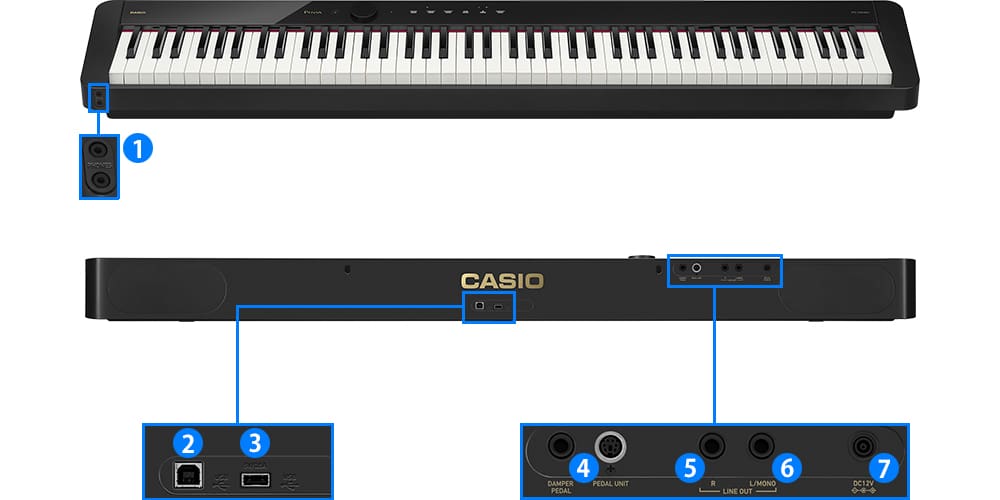 ①PHONES jack x 2: Stereo mini phone jack (mini TRS phone) x 2 ②USB Type B port ③USB Type A port ④DAMPER PEDAL jack ⑤PEDAL UNIT jack ⑥LINE OUT R, L/MONO jacks ⑦DC 12V terminal