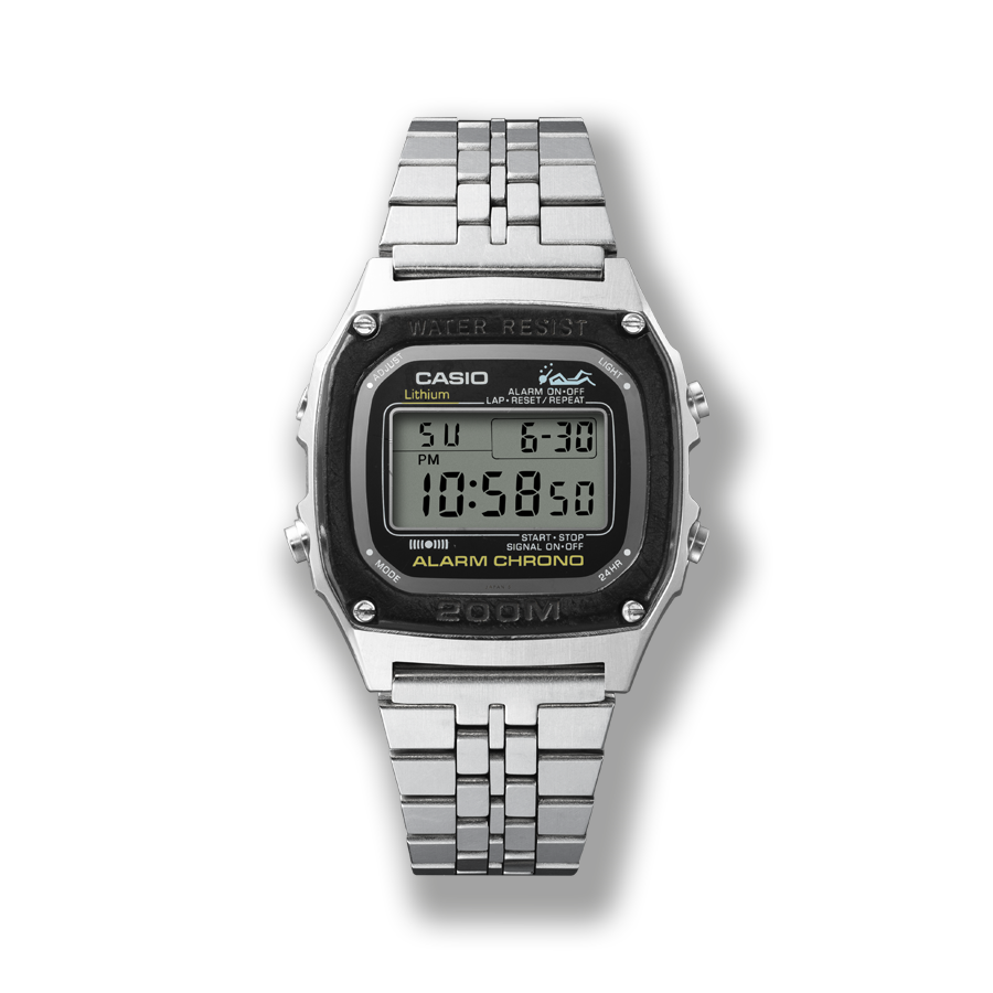 Equipped with the same movement as its peer, the F-91W, the A159W employs a metal band. The case features metallic color as well, to match the band. Crafted in Japan by the highly skilled engineers at Yamagata Casio, the watch is still sold around the world today, a long-selling favorite alongside the A158, which shares the same specs, but a different production location.
