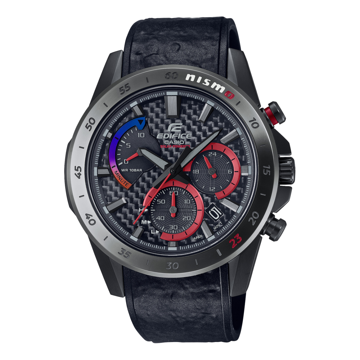 This new EDIFICE features a design inspired by the NISMO works team. NISMO competes in the GT500, the top category of the SUPER GT, the world-renowned motorsport championship originating in Japan. This special edition is designed to capture the spirit and worldview that NISMO pursues on the racetrack.
