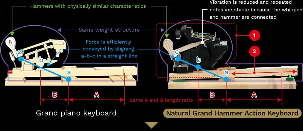A posição do ponto de rotação foi concebida como num piano de cauda. Isto contribui para um comportamento de execução estável, uma vez que a batida tem sempre a mesma força, independentemente do local onde a tecla é tocada.