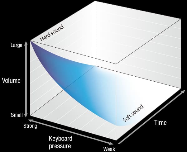 Não só é registada a força total de uma tecla tocada, como também todo o percurso da tecla é reproduzido exatamente como num piano de cauda.