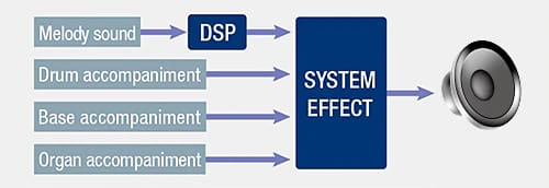 O processador de sinal digital de alta velocidade também é aplicado para cada tipo de som, como melodia, bateria e baixo de acompanhamento ou órgão. Até o conjunto padrão para um teclado proporciona um som distinto para cada instrumento para um desempenho expressivo.