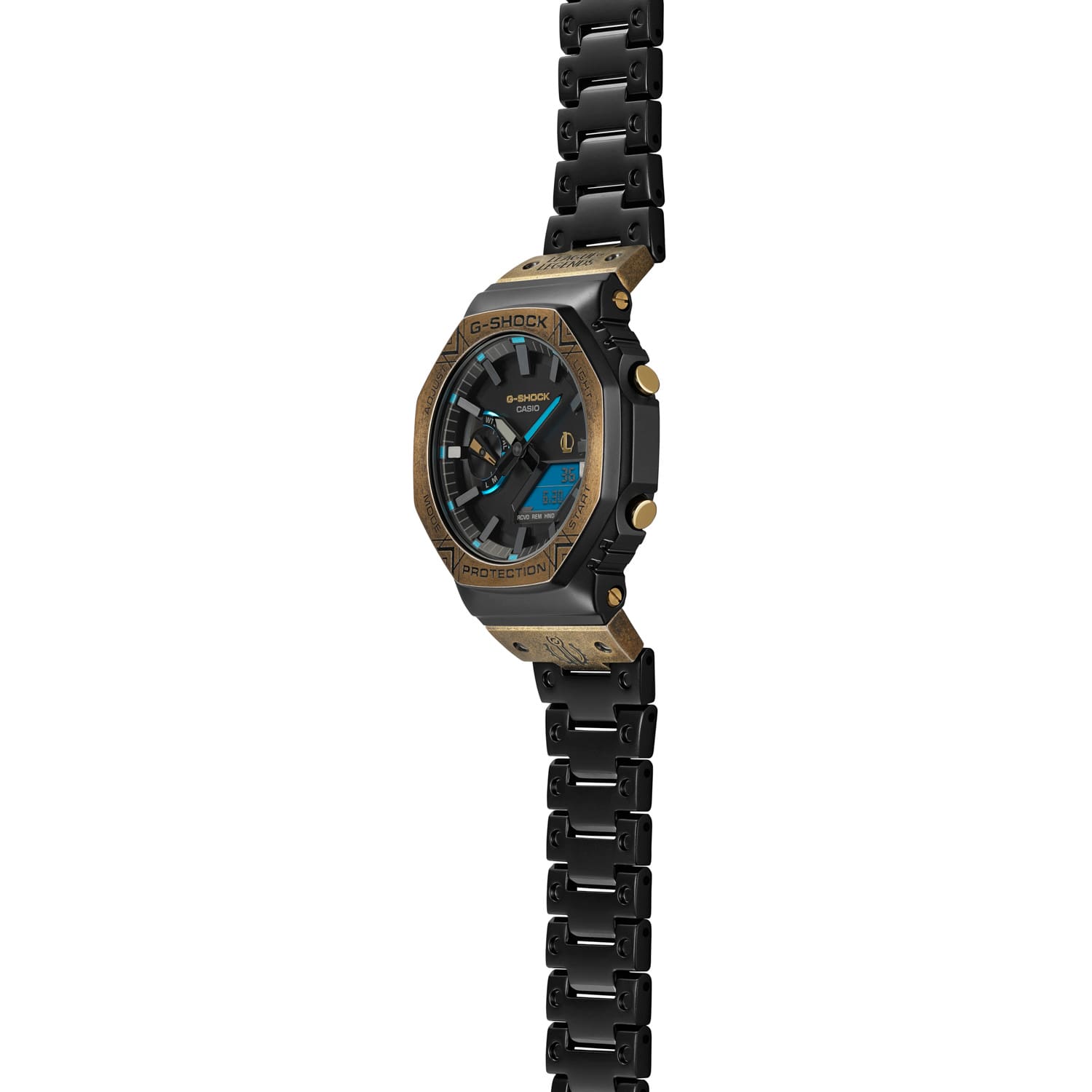 Começamos com o relógio analógico de metal GM-B2100 e apresentamos a tecnologia mágica Hextech, tão importante para o mundo de Runeterra em League of Legends. A luneta e parte da bracelete são acabadas com um revestimento iónico inicial em dourado, seguido de preto, que é depois parcialmente removido para criar um aspeto gasto e envelhecido. Os toques azuis eficazes no LCD e noutros locais trazem a fusão Hextech de magia, ciência e tecnologia para o mundo do G-SHOCK.