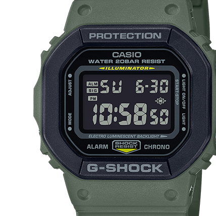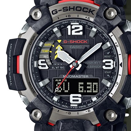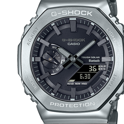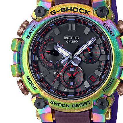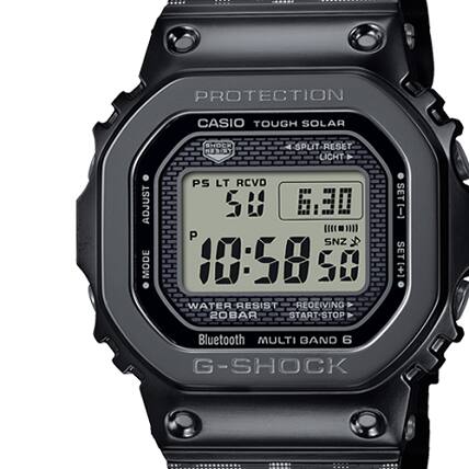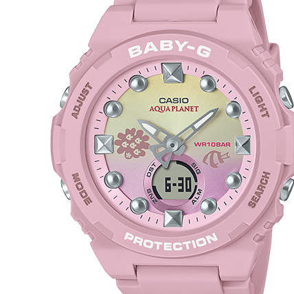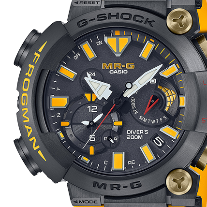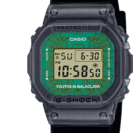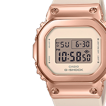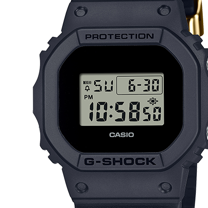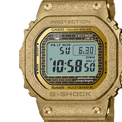 This collaboration between BAPE® and G-SHOCK is the first model to feature a metal bezel on the GM-6900. The body is fully covered with BAPE® CAMO, and the ring around the face has a gold color metallic finish. The letter B, for BAPE®, is marked on the front button. The replacement cloth band is specially designed with multi-hued BAPE® CAMO.