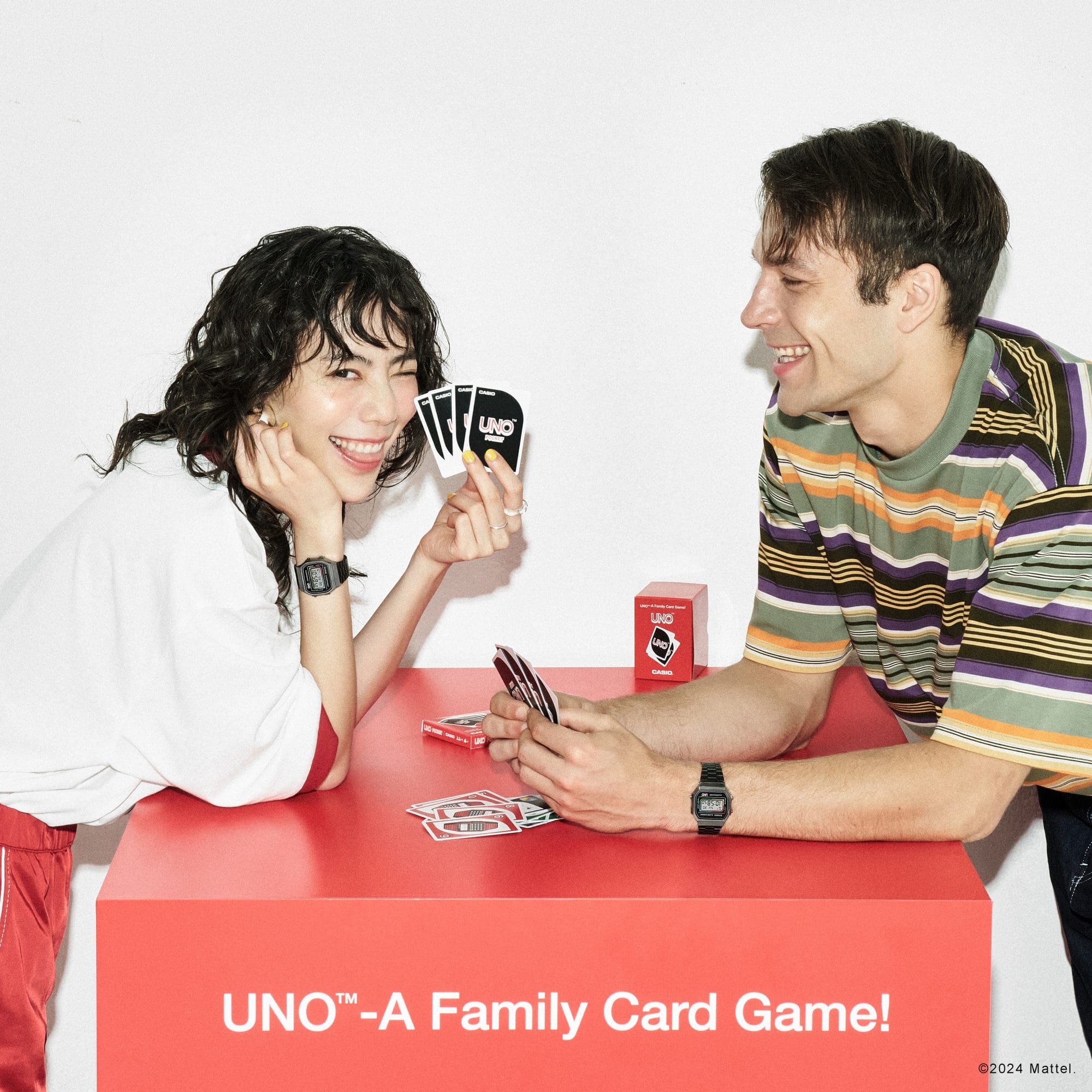 Presenting a collaboration between Casio watches and UNO™, the card game from Mattel, a pairing of two brands born in the 1970s. The collaboration model is based on the popular vintage style of the A168 watch and incorporates retro pop colors and design touches inspired by classic UNO™ cards throughout. These details, including on the watch face, case back, and band, project a casual sense of fun in a special watch that delivers a timeless sparkle that transcends the generations.