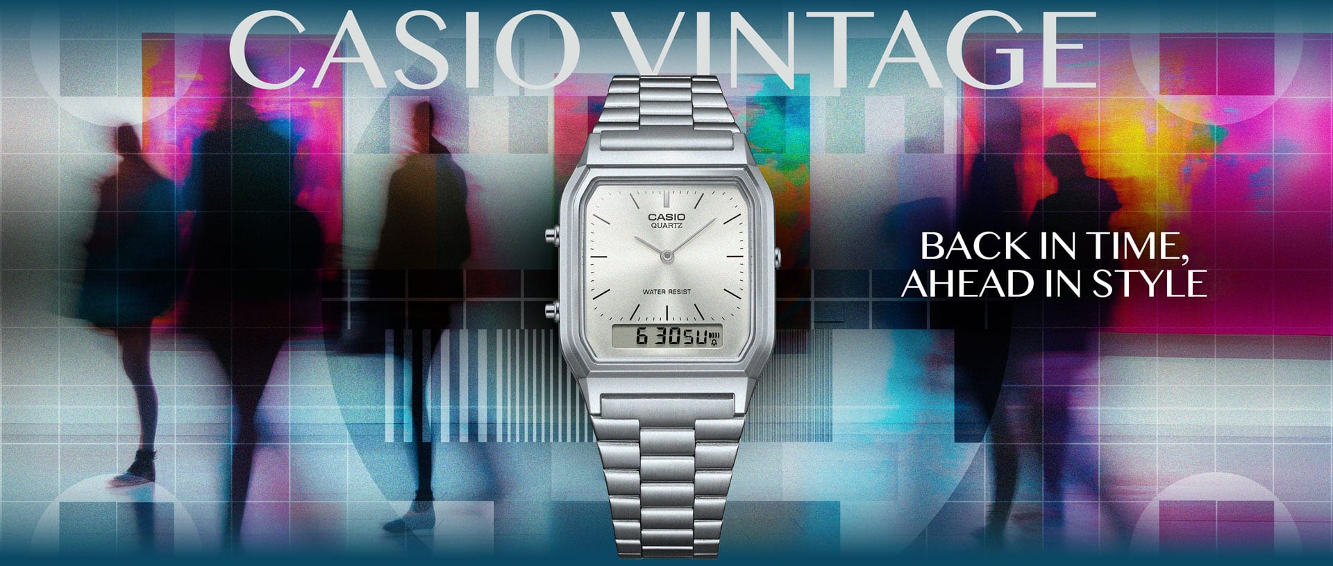CASIO Vintage watches available online and at G-SHOCK stores in Ion Orchard, Takashimaya, Bugis, Vivocity, Jewel, Northpoint, and JEM.