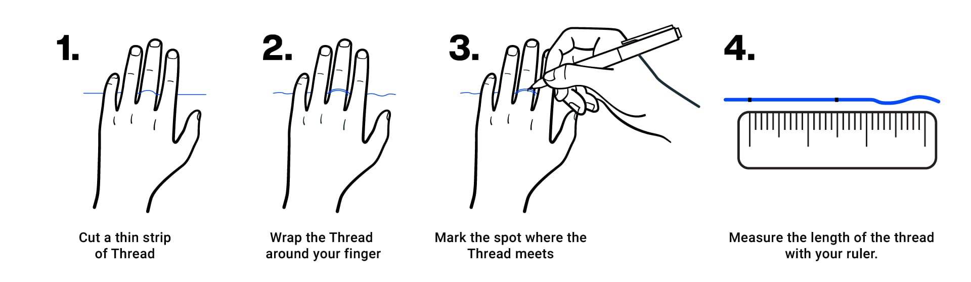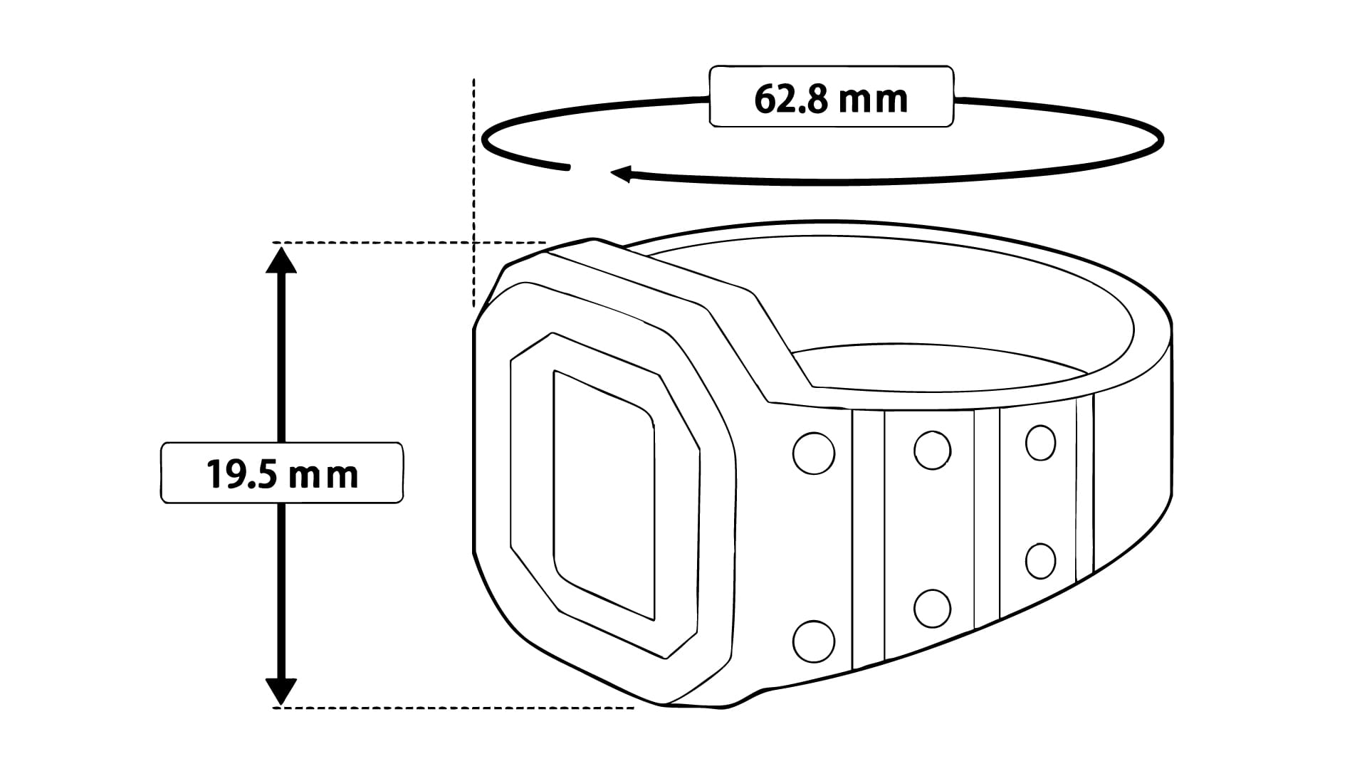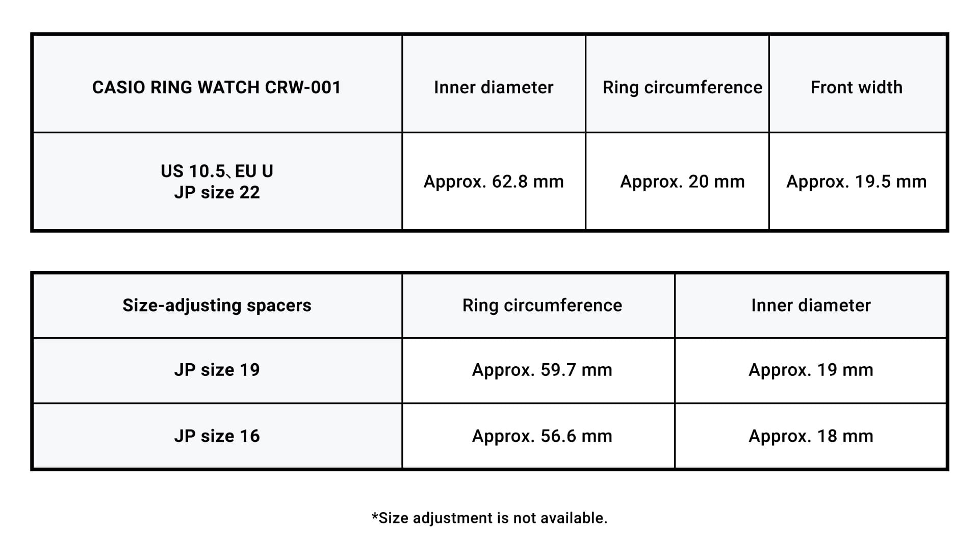 The ring fits a size 22 finger (US 10.5, EU U). Two size-adjusting spacers for sizes 19 and 16 are also included.