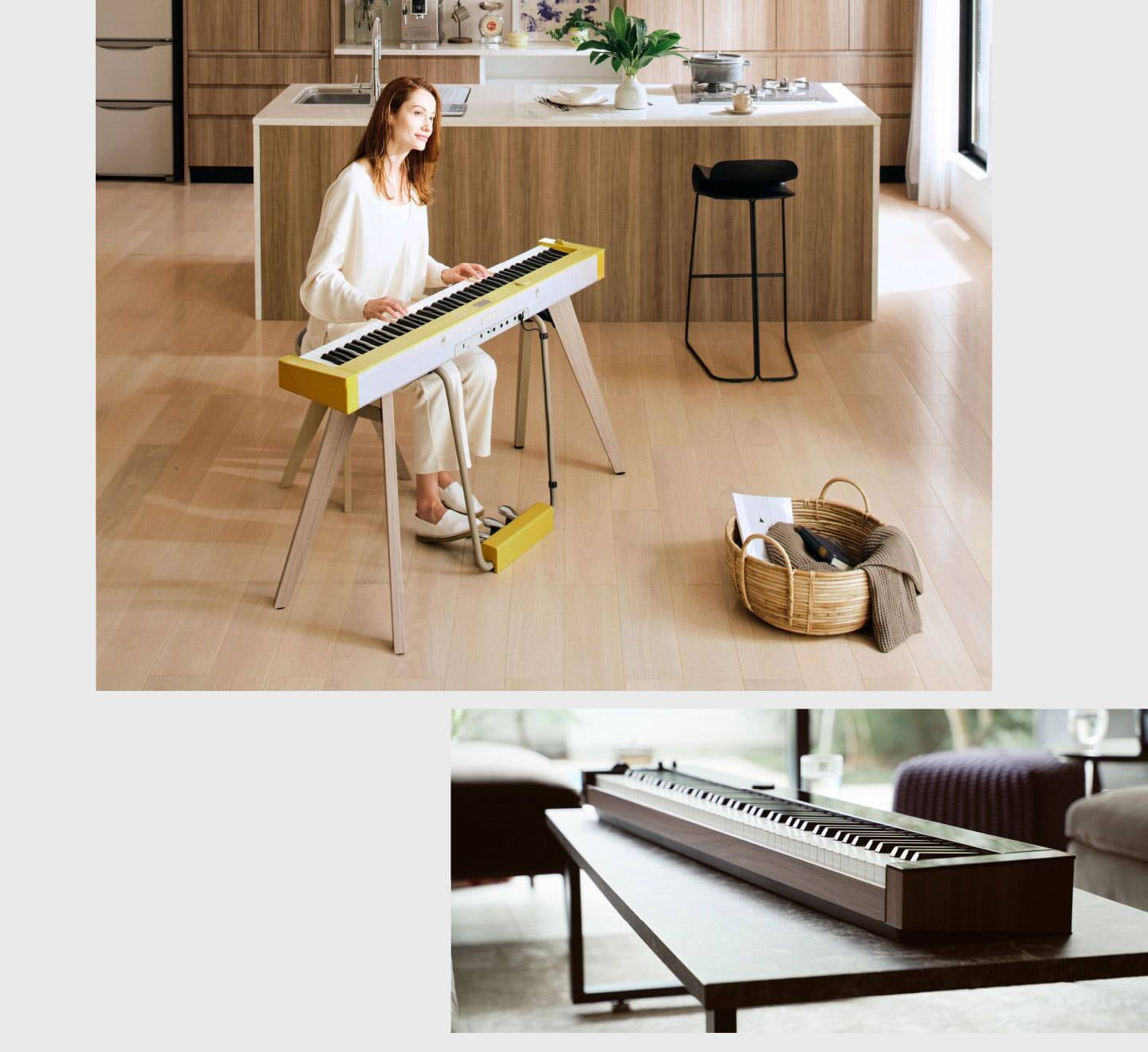 ความหลากหลายของสีในรุ่น PX-S7000/PX-S6000 ได้รับการคัดเลือกมาอย่างพิถีพิถันเพื่อให้เปียโนมีความสอดคล้องกับสภาพแวดล้อมต่างๆ PX-S7000 มาในโทนสีดำแบบคลาสสิก สีขาว และ “Harmonious Mustard” ซึ่งเป็นโทนสีเหลืองอันนุ่มนวลที่ได้รับแรงบันดาลใจจากสไตล์การตกแต่งภายในแบบยุโรปและมีการผสมผสานอย่างสมบูรณ์แบบเพื่อถ่ายทอดสัมผัสแห่งความเป็นเอกลักษณ์ สีอันสวยงามนี้ได้รับการออกแบบมาให้สอดคล้องกับสภาพแวดล้อมที่แตกต่างกันมากมายและเพิ่มความสว่างให้กับทุกพื้นที่ด้วยการเป็นของตกแต่งภายใน ในขณะเดียวกัน รุ่น PX-S6000 สีดำเงามีส่วนที่เป็นลวดลายไม้ที่ให้รูปลักษณ์อันเป็นธรรมชาติและสามารถผสมกับห้องได้หลากหลาย ตั้งแต่สี “Harmonious Mustard” ของ PX-S7000 ไปจนถึงรุ่นสีดำสองสีของ PX-S6000 คุณสามารถเลือกดีไซน์ที่เหมาะกับคุณและสไตล์ของคุณได้มากที่สุด