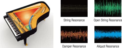 เสียงสะท้อนหลากหลายประเภทในแกรนด์เปียโนสำคัญมากต่อประสบการณ์การเล่น CELVIANO Grand Hybrid ใช้เสียงสะท้อนจากสาย ซึ่งแสดงความสัมพันธ์ที่สอดประสานระหว่างสายหลายสายเมื่อมีการเคาะคีย์ นอกจากนี้ เสียงสะท้อนจากแดมเปอร์จะสร้างเสียงสะท้อนที่เกิดขึ้นเมื่อมีการกดแป้นแดมเปอร์ GP-510BP นั้นมาพร้อมฟังก์ชันสร้างเสียงสะท้อนจากสายแบบเปิดและ Aliquot Resonance เพื่อความสมจริงที่ดียิ่งขึ้น ระบบเสียงสะท้อนของ Casio จำลองเสียงสะท้อนของทั้งสายและซาวด์บอร์ดของแกรนด์เปียโนโดยการเลือก ควบคุม และสังเคราะห์ตามสภาพของการเล่น