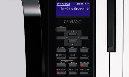 การควบคุมอย่างเป็นธรรมชาติของ CELVIANO Grand Hybrid สามารถทำได้จากแผงควบคุมที่ออกแบบมาอย่างละเอียด Berlin Grand, Hamburg Grand และ Vienna Grand สามารถเข้าถึงได้ด้วยปุ่มเฉพาะสำหรับแต่ละโทนของเปียโน