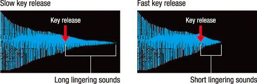ความยาวของเสียงก้องที่เกิดขึ้นจากแกรนด์เปียโนจะแตกต่างกันขึ้นอยู่กับความเร็วที่ผู้เล่นปล่อยนิ้วหลังจากสัมผัสคีย์ ในทำนองเดียวกัน ฟังก์ชันจำลองการปล่อยคีย์ของ Casio จะควบคุมความยาวของเสียงเหล่านี้ โดยยึดตามความเร็วของการปล่อยคีย์ และให้หางเสียงที่เป็นธรรมชาติ ฟังก์ชันนี้จะทำให้ผู้เล่นสามารถเผยความแตกต่างเล็กน้อยที่ละเอียดอ่อนเมื่อเล่นสตัคกาโตและเลกาโต
