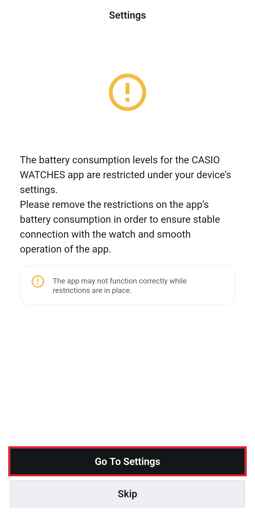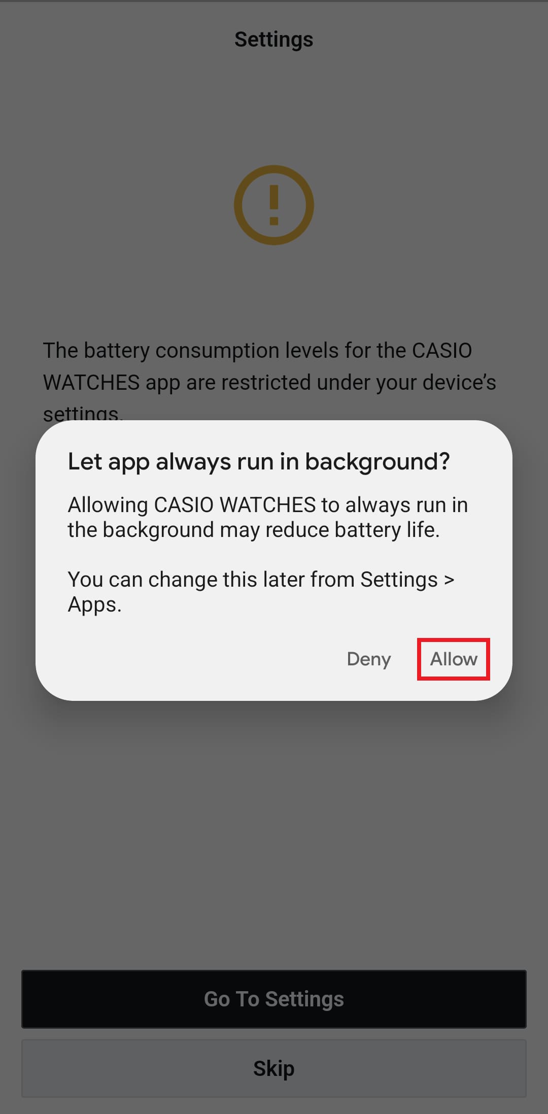 ・[การตั้งค่า] > [แอป] > [CASIO WATCHES] > [การใช้งานแบตเตอรี่ของแอป] ตั้งเป็น "อนุญาตการใช้งานในพื้นหลัง"