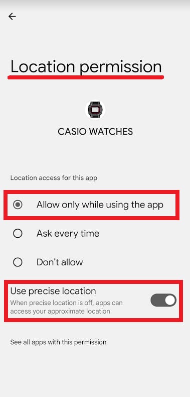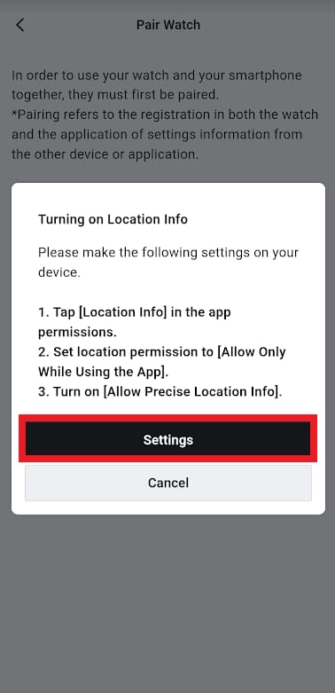 ・[การตั้งค่า] > [แอป] > [CASIO WATCHES] > [การอนุญาต] > [ตำแหน่ง] > เปิด "ใช้ตำแหน่งที่แน่นอน"