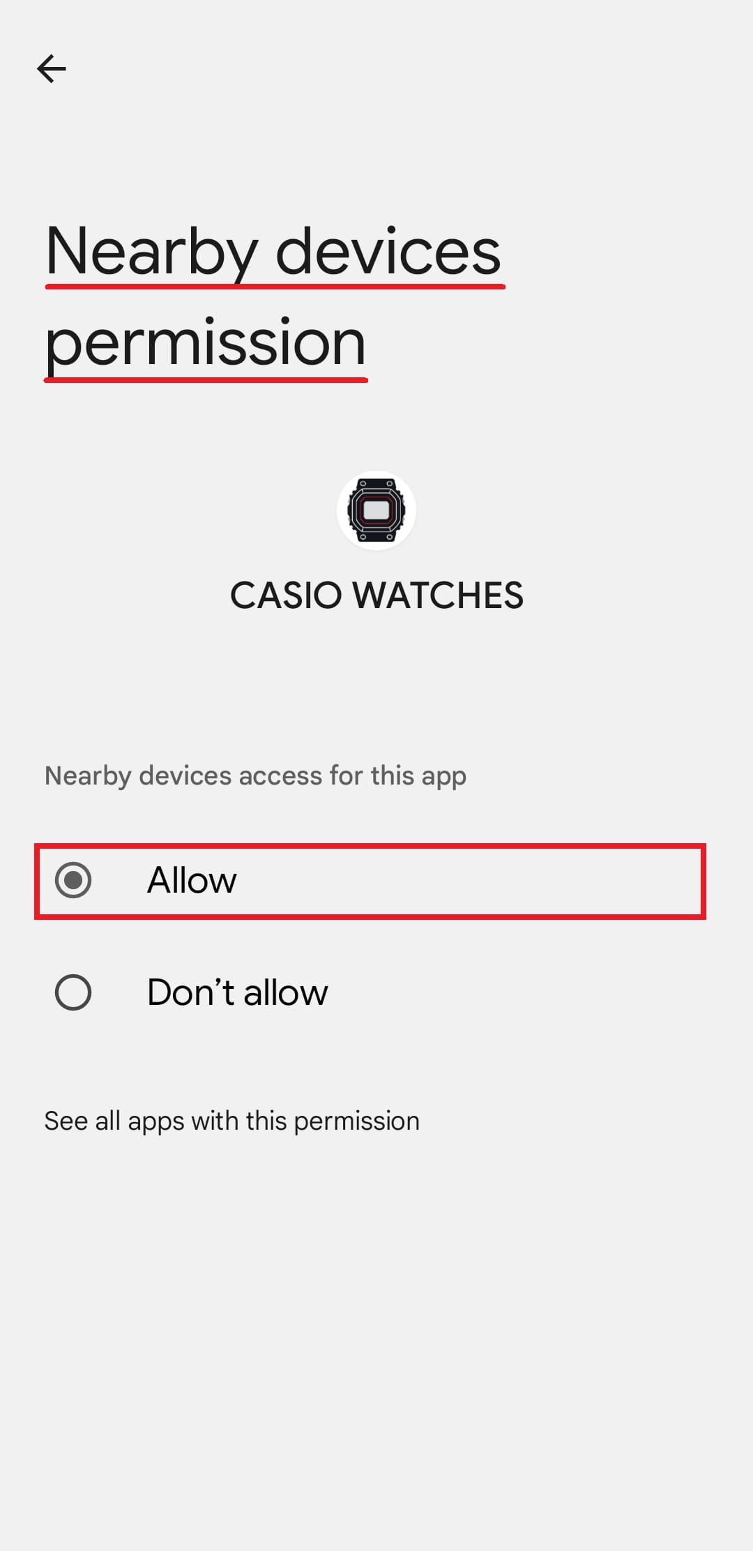 ・[การตั้งค่า] > [แอป] > [CASIO WATCHES] > [การอนุญาต] > [อุปกรณ์ใกล้เคียง] ให้การอนุญาต (Android 12 หรือสูงกว่า)