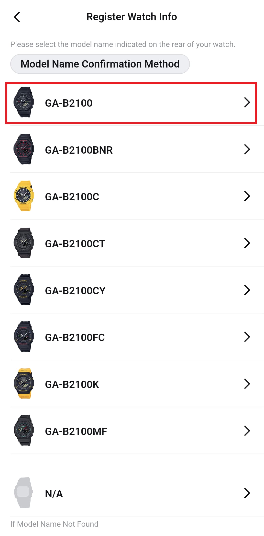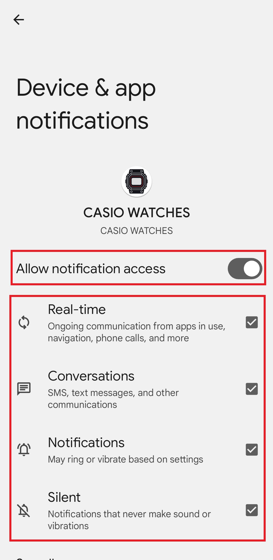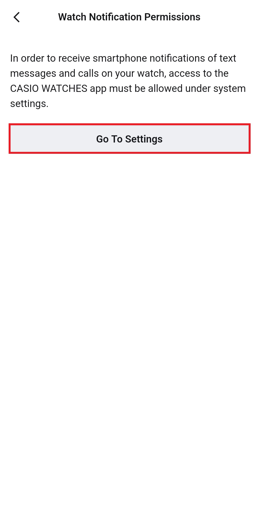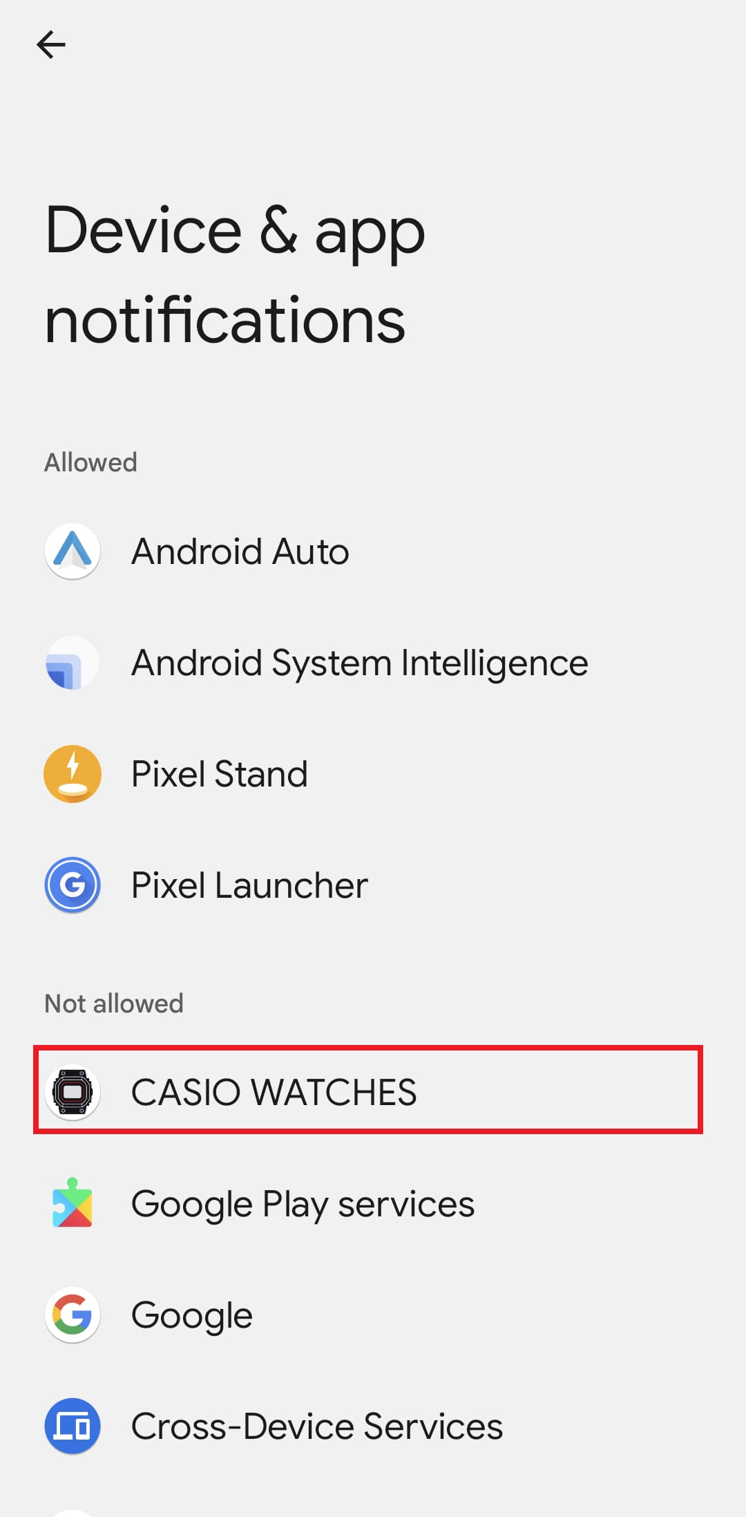 บนหน้าจอ My Watch (นาฬิกาของฉัน) ในแอป "CASIO WATCHES" เลือกนาฬิกาที่คุณกำลังใช้และเปิดการตั้งค่าภายใต้ "การอนุญาตการแจ้งเตือนนาฬิกา"