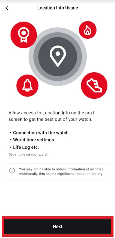・[การตั้งค่า] > [CASIO WATCHES] > [ตำแหน่ง] > ตั้งค่าการอนุญาตใช้ตำแหน่งเป็น "อนุญาตตลอด"