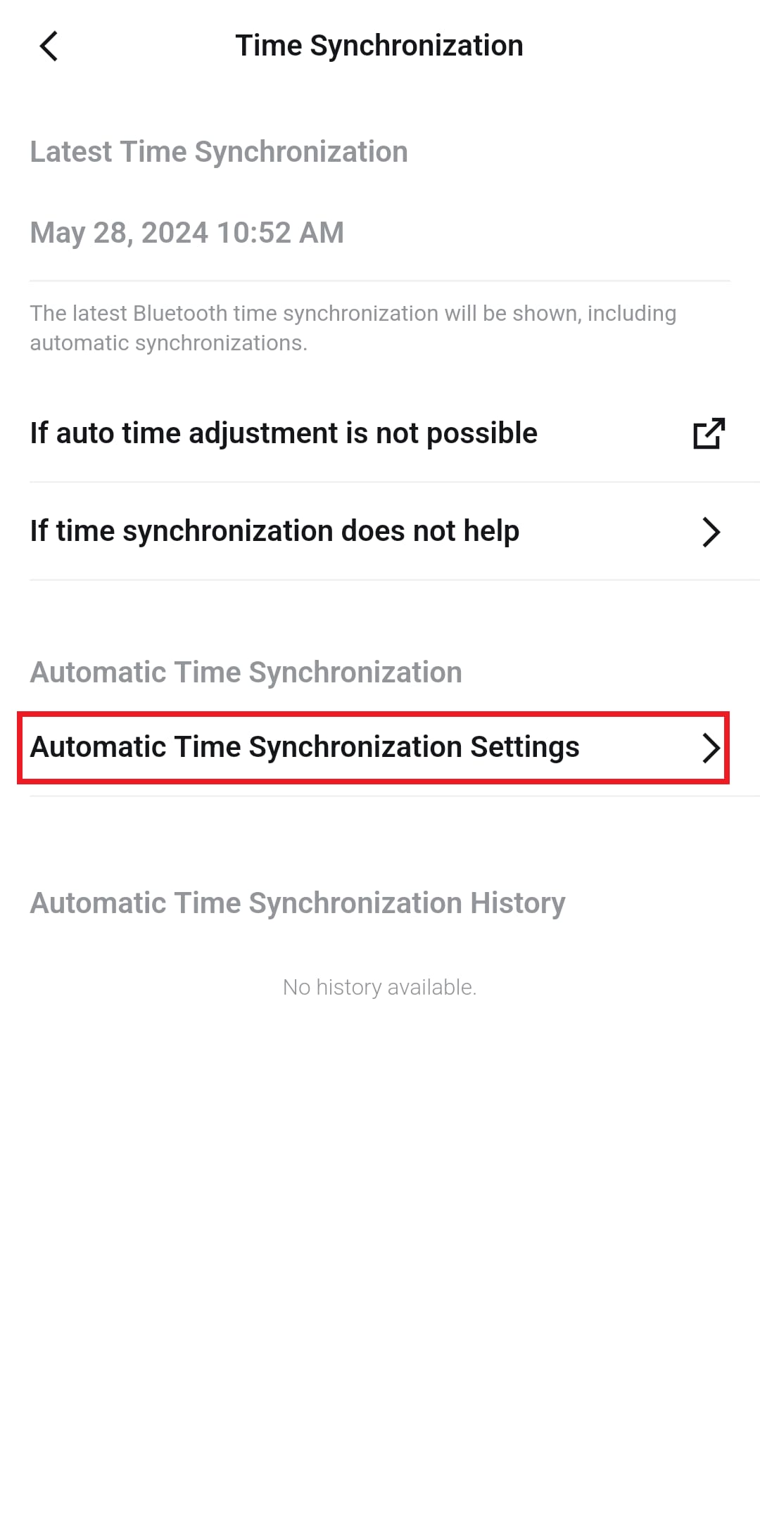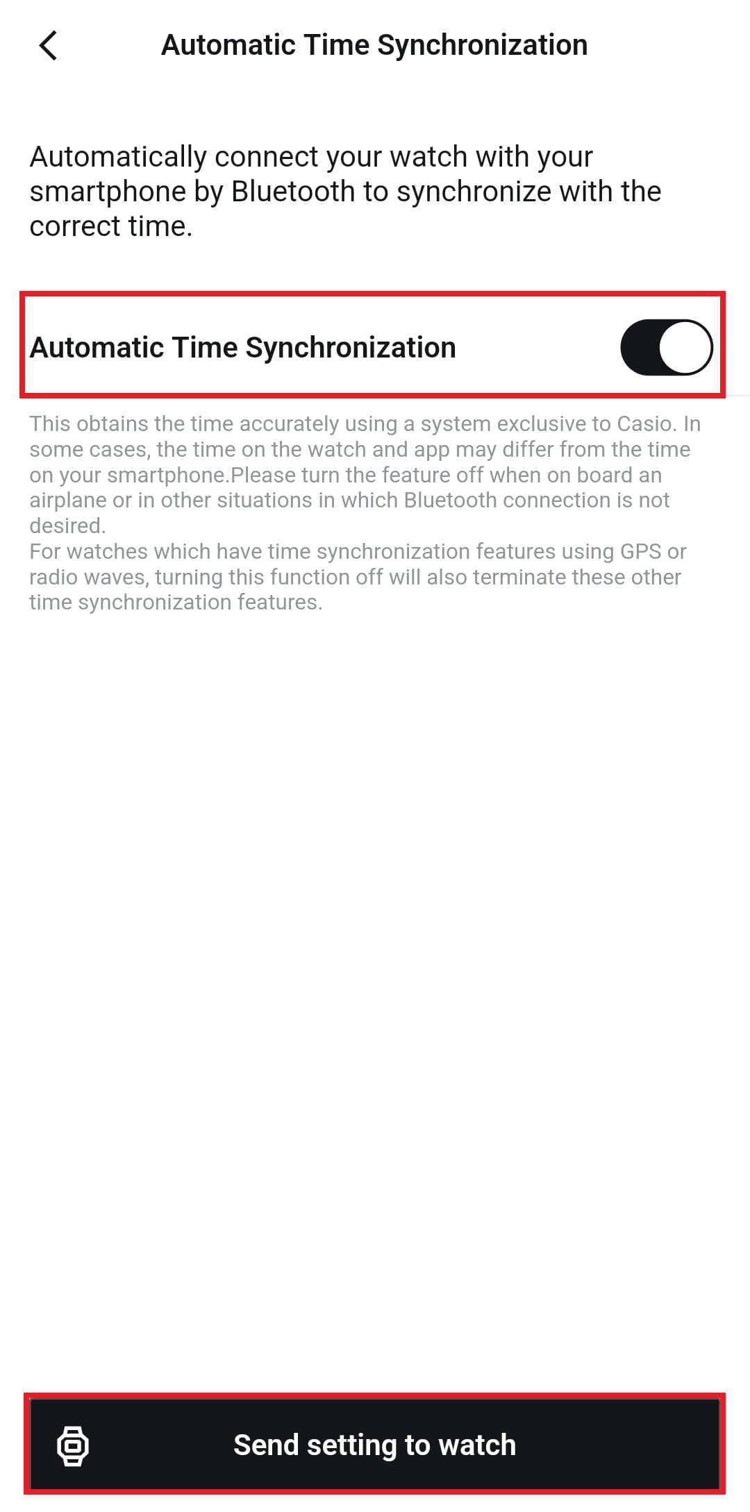 ・เลือกนาฬิกาที่เกี่ยวข้องบนหน้าจอ My Watch (นาฬิกาของฉัน) และเปิด "การซิงโครไนซ์เวลาอัตโนมัติ"