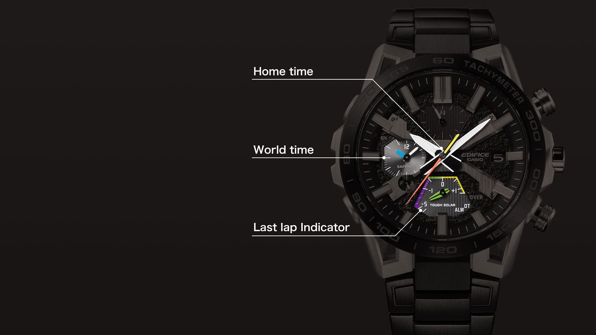 นำเสนอฟังก์ชันการทำงานสำหรับทีมที่เดินทางไปสนามแข่งทั่วโลกโดยอำนวยความสะดวกในการประสานงานกับโรงงานหลัก เวลาท้องถิ่นและเวลาของเมืองหลักสามารถแสดงพร้อมกันได้ โดยหน้าปัดหลักจะแสดงเวลาของเมืองหลักและหน้าปัดย่อยที่ตำแหน่ง 9 นาฬิกาจะแสดงอีกอย่างหนึ่ง ตัวระบุเวลารอบสุดท้าย ซึ่งแสดงเวลาที่แตกต่างกันของรอบก่อนหน้า มีประโยชน์สำหรับการติดตามสภาพการแข่งที่มีการเปลี่ยนแปลงอยู่ตลอดเวลา