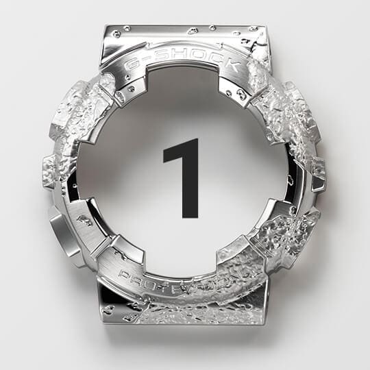 ในกระบวนการสร้างสรรค์กรอบที่หุ้มด้วยโลหะ เราได้ใช้การขึ้นรูปด้วยแม่พิมพ์พิเศษ ก่อให้เกิดรูปลักษณ์ขรุขระที่ได้รับแรงบันดาลใจมากจากแร่ทั่วทั้งด้านหน้าของกรอบ และเรายังได้ใช้การเคลือบและขัดเงาที่ไม่เหมือนกันในแต่ละส่วน ตั้งแต่ด้านบนจนถึงด้านข้าง ทั้งแบบขนแมวและแบบกระจก รูปทรง ลักษณะพื้นผิว และการส่องประกายของหินแต่ละก้อนได้รับการถ่ายทอดผ่านเทคโนโลยีโลหะสุดพิเศษ